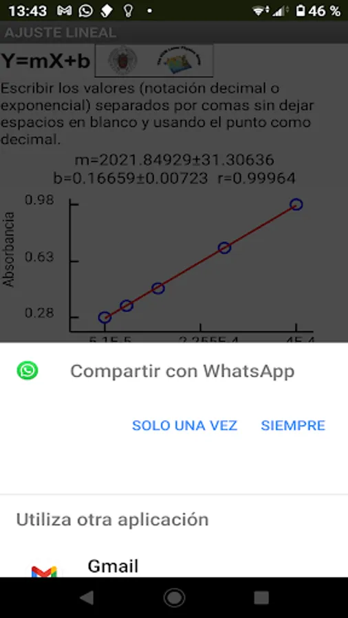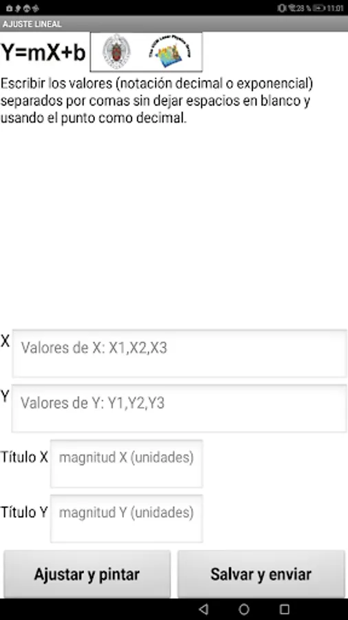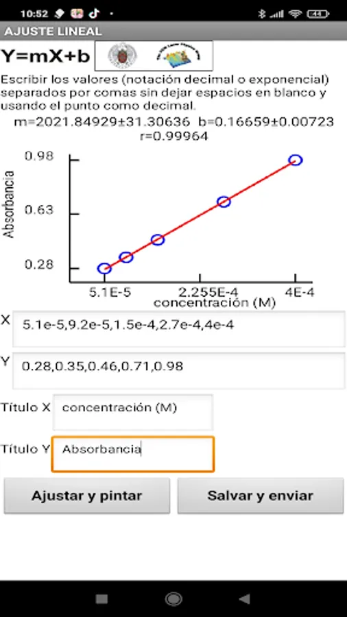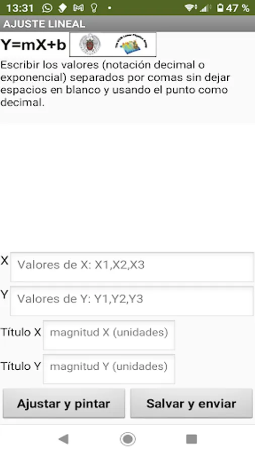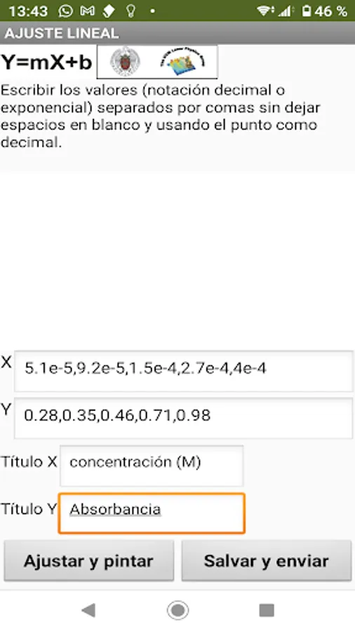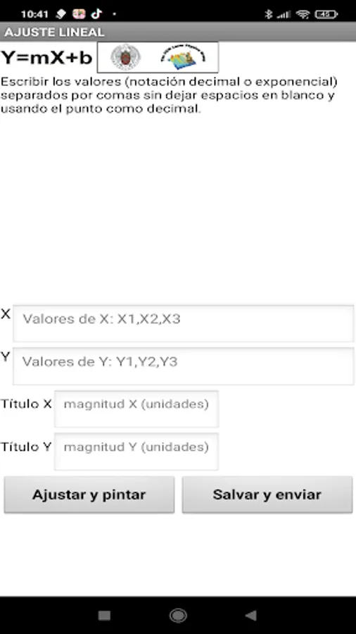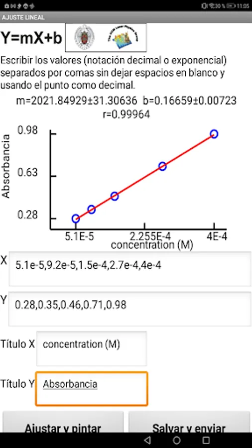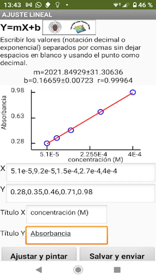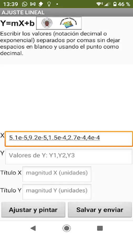 This application performs a linear adjustment of the data supplied in X Y format. First, the data for X are entered in one cell and the data for Y in another cell. Numbers must be written separated by commas and without white space. The point is the decimal symbol. Numbers can be entered in decimal or exponential notation (0.000345 or 3.45e-4). Pressing the "Fit and Paint" button performs the linear fit. The application calculates the line Y = m * X + b that best fits (by least squares) to the data and displays the value of the slope "m" and the ordinate at the origin "b". The errors of these magnitudes and the correlation coefficient that indicates the goodness of the fit are also shown. The graph that includes the data and the fit line is also shown. Titles can be added to axes. By pressing the "Save and send" button, the graph will be sent using the available resources of the device.