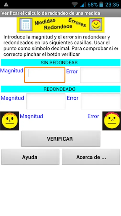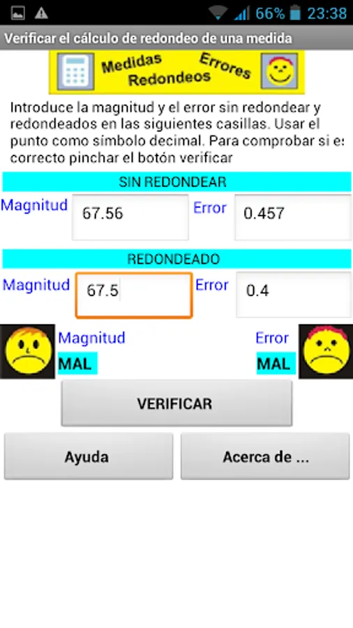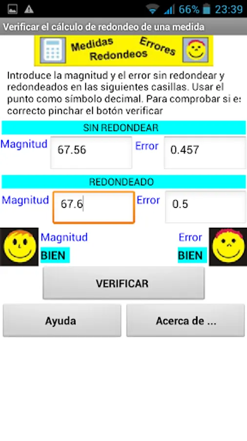 First we introduce in their respective fields the values of the measured quantity and its error without rounding, ie as we have obtained to carry out the relevant operations. Both values must be in the same unit, using the point as decimal symbol. In the following sections the rounded values of the magnitude error and consider written by the user. To verify that the error and magnitude are properly expressed click the "Verify" button. The display shows if both are correct. The check is made internally using a code written in Python that runs on a browser using Skulpt. The code has been developed by Elena Diaz Garcia, Eduardo Cabrera and Oscar Gómez Granado Calderon.