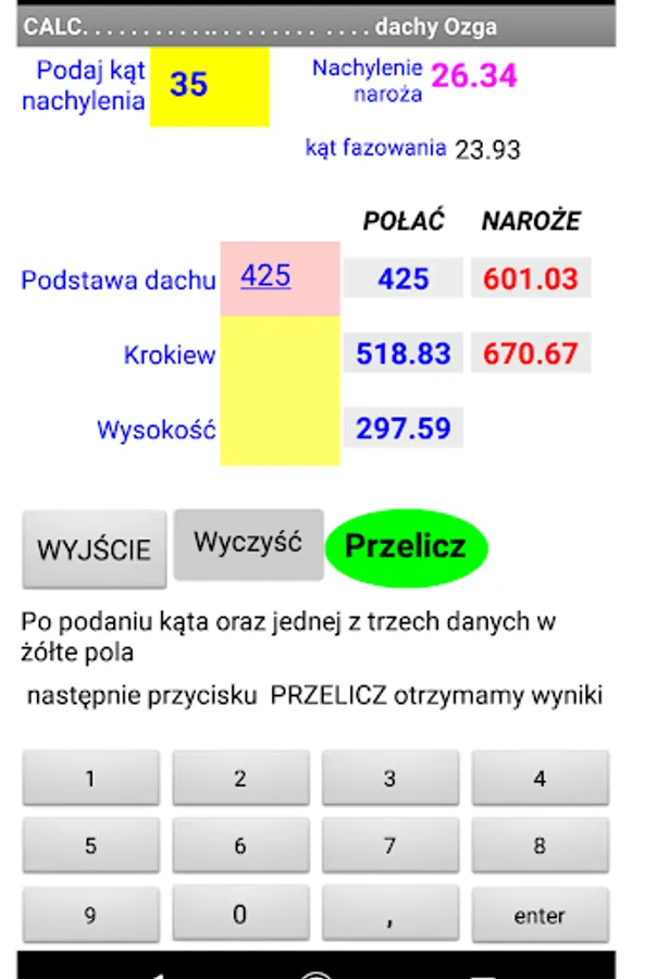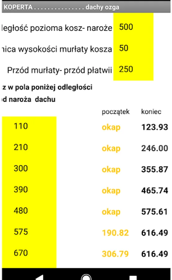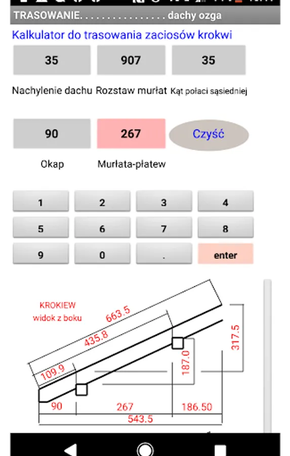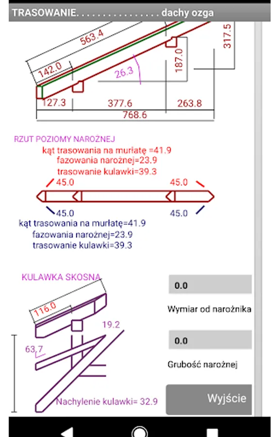 After entering the basic data characterizing the roof slope, we get the results regarding the length of the rafters. Both the place of cutting to the roof valley and the corner.