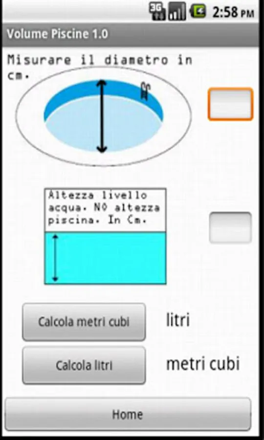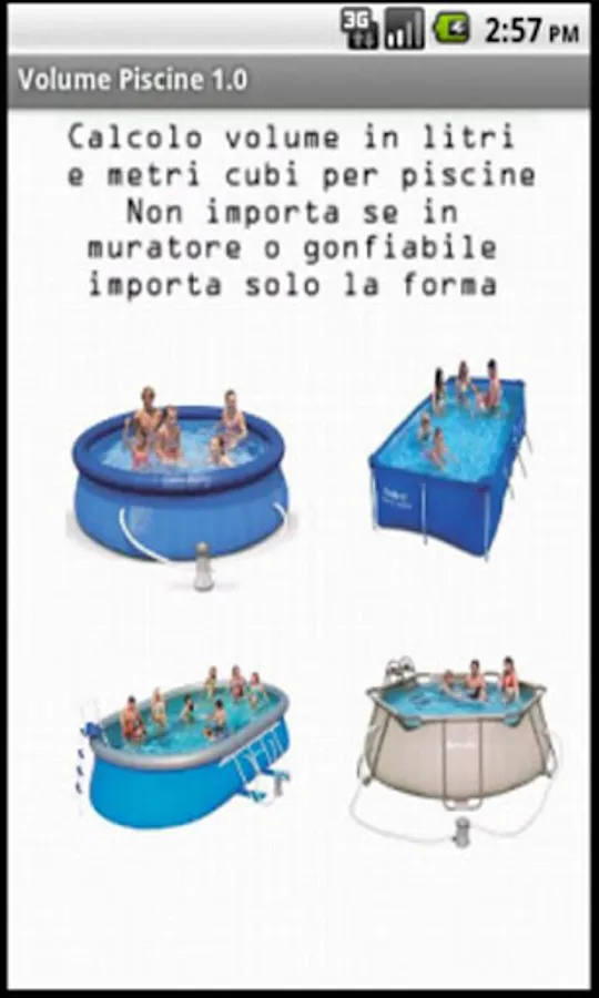 Application to calculate the volume in liters and cubic meters of swimming pools. Very useful for the addition of chlorine and chemicals such as chlorine and tri alighicida bicloro.