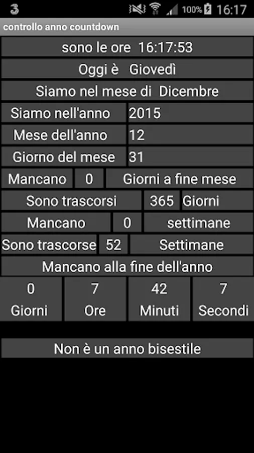 Year countdown, displays time, day, month, year, then displays the current days, months, weeks passed, and leads the countdown to what is missing at the end of the year with days, hours, minutes and seconds.
