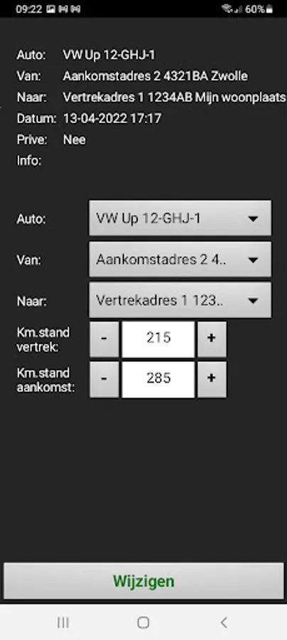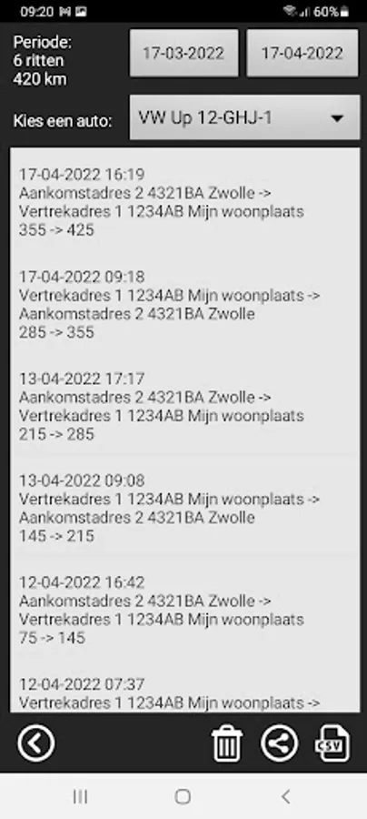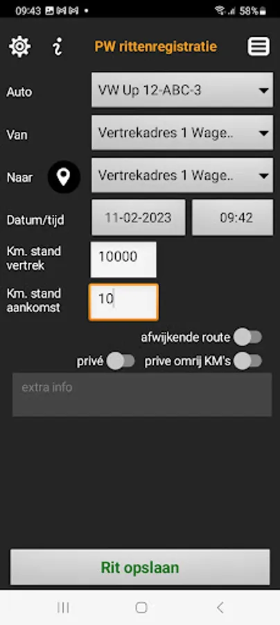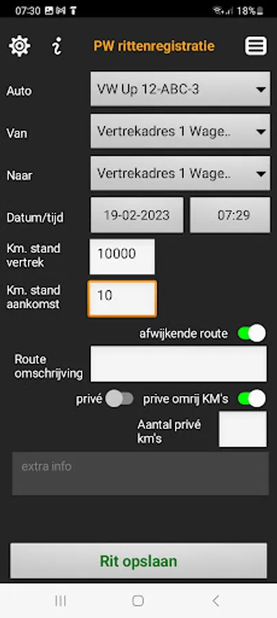 Adding a ride is quick and easy upon arrival at the location. Just click on the destination (or possibly from the 'location') and fill in the final mileage. If desired, you can indicate in the settings whether the thousands have already been entered. If desired, new locations can also be saved directly as reusable locations in the app to be able to choose from the drop-down list next time. There is a setting for this.