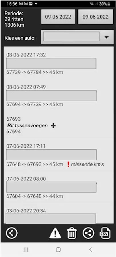 If the kilometers or location of consecutive rides do not match, this will be shown in the ride screen. However, if you choose in the settings that there may be gaps between mileage of rides, the errors related to missing miles will not be shown.
