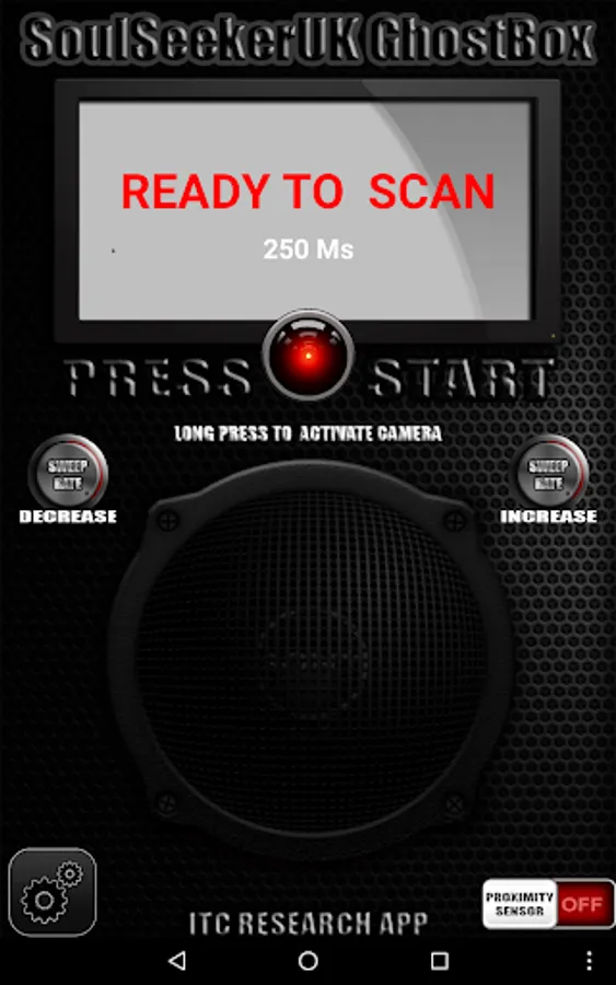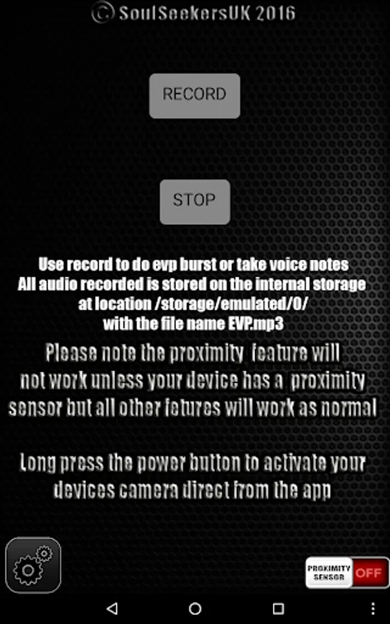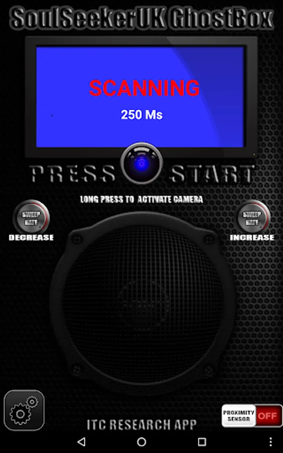 I also included a proximity alarm this can be activated using the proximity sensor button bottom right ( please note your device needs to have a proximity sensor for this feature to work) if your device does not have a proximity sensor that this feature will not be available but will not affect the ghost box in anyway. Once set anything that moves in front of the device will trigger an alarm.