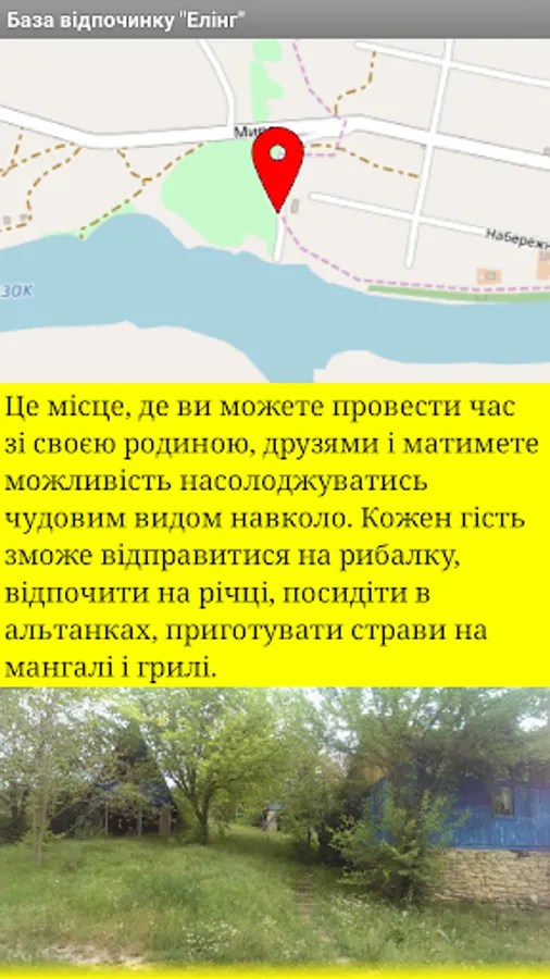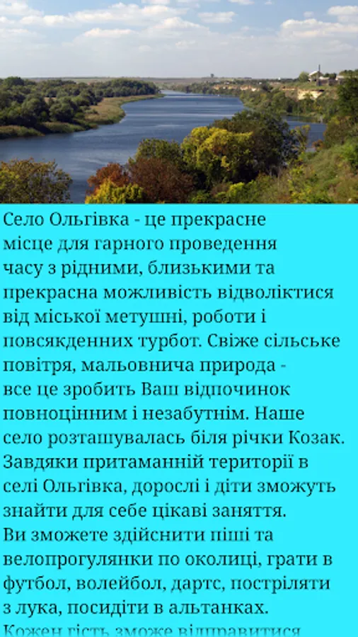 "Ola" - is an application that helps people navigate and find a good place in the village Olhivka. Olhivka Village - a great place for a good time with family, friends and a great opportunity to get away from city life, work and everyday worries. Agriculture Fresh air, beautiful nature - all this will make your vacation complete and unforgettable. Our village is located near the river Kozak. Due to the inherent territory of the village Olhivka, adults and children will find interesting lessons. You can make walking and cycling around the neighborhood, playing soccer, volleyball, darts, archery, sit in the gazebo. Each guest can go fishing, relax on the river, cook meals on the grill and grill.