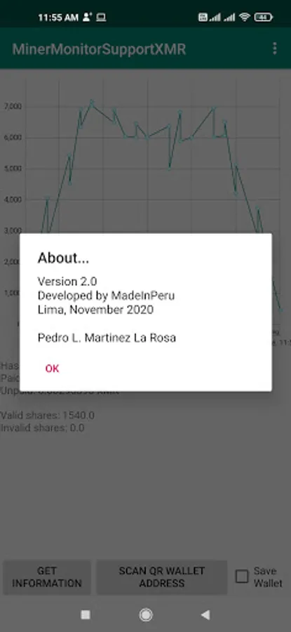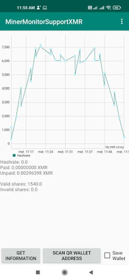 Scan your wallet address using a QR code, check save if you want to make it permanent in your phone. Then wait for information requested to SupportXMR pool, the application will show your hashrate and payments.