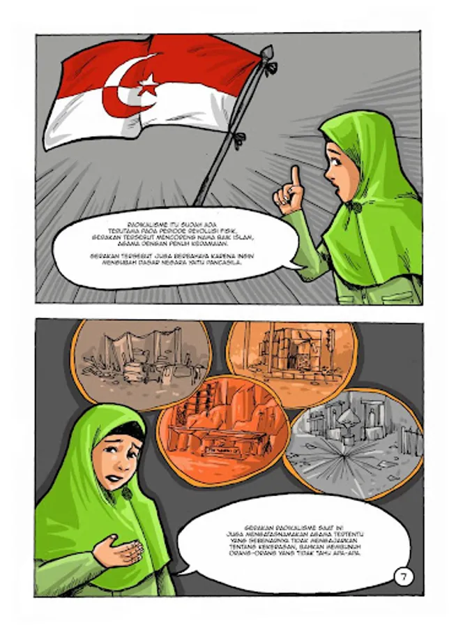 Radicalism basically can be prevented mainly by inculcating nationalism through Citizenship Education, which also discusses historical knowledge. Therefore, the development of instructional media using comic media, in which discussing the historical knowledge of Islamic harmony taught by the saints, for example are Sunan Kalijaga and Sunan Bonang which are loaded with a tolerance load between religious communities, then added to the story of the rebellion DI / TII The two stories raised in the comic are packed with light conversations and are made as interesting as possible so that students are interested in reading and don't experience boredom. With two stories raised, his hopes are able to ward off radicalism, as well as foster a sense of nationalism and students' patriotism. Students are able to understand that the DI / TII movement is a movement that is not in line with the cultural principles of Indonesian society and contradicts the values of Pancasila, while at the same time providing understanding that Islam is a religion full of peace and harmony so that tolerance thrives in the souls of the nation's next generation, hand in hand with a sense of pride in the culture of the Indonesian people themselves.