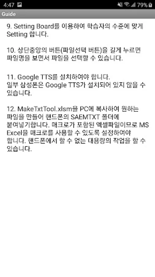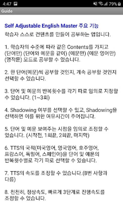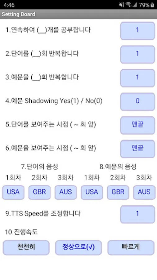 텍스트를 보는 시점, 반복횟수 및 다시듣기, TTS 속도 및 진행속도를 조절할 수 있다