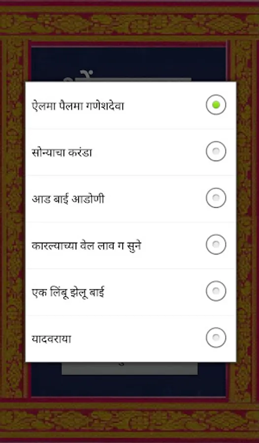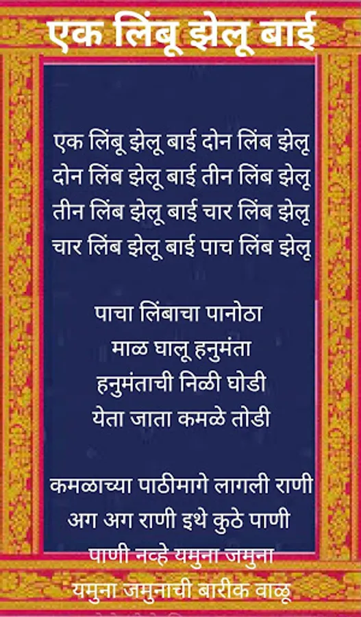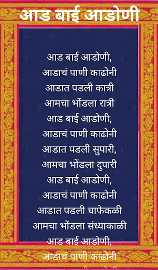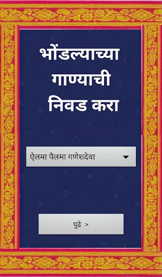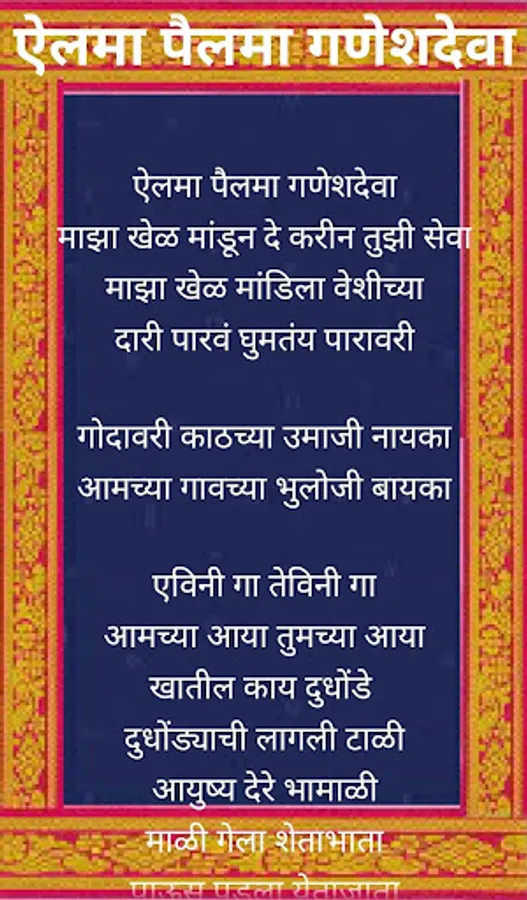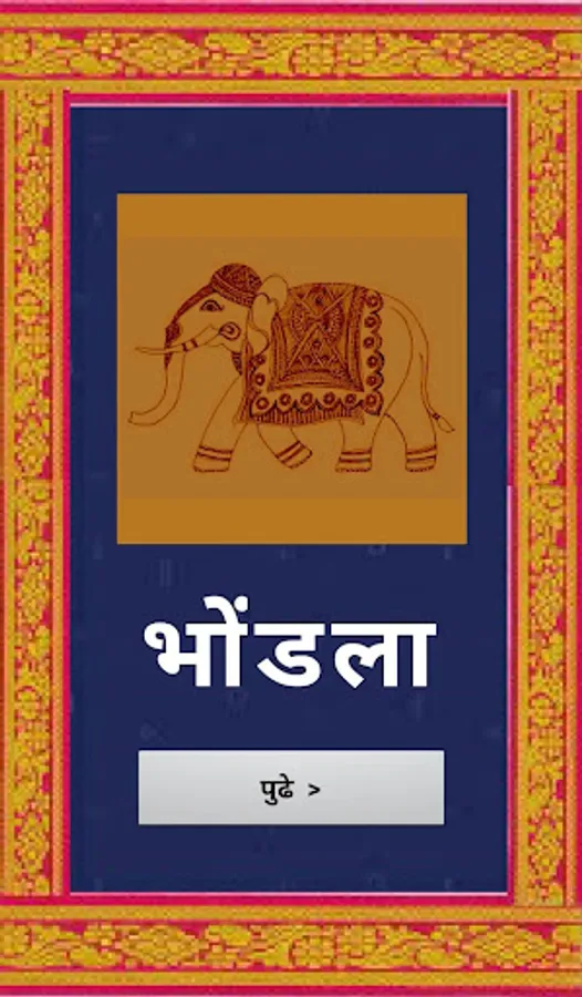 Bhondla (भोंडला ) is a cultural tradition celebrated in India as the Sun moves to the thirteenth constellation of the zodiac called Hasta'. "All the sixteen days between Ghatasthapana and Kojagiri Purnima, We see young girls and women celebrating the Bhondla with a lot of enthusiasm and energy. A rangoli, representing a motif of an elephant is drawn either on the floor or on a paat (low wooden stool). The girls go around this arrangement in a circle, holding each other's hands and singing the Bhondla songs. All the Bhondla songs are traditional songs passed down from generation to generation and now are also available on Android via this app.