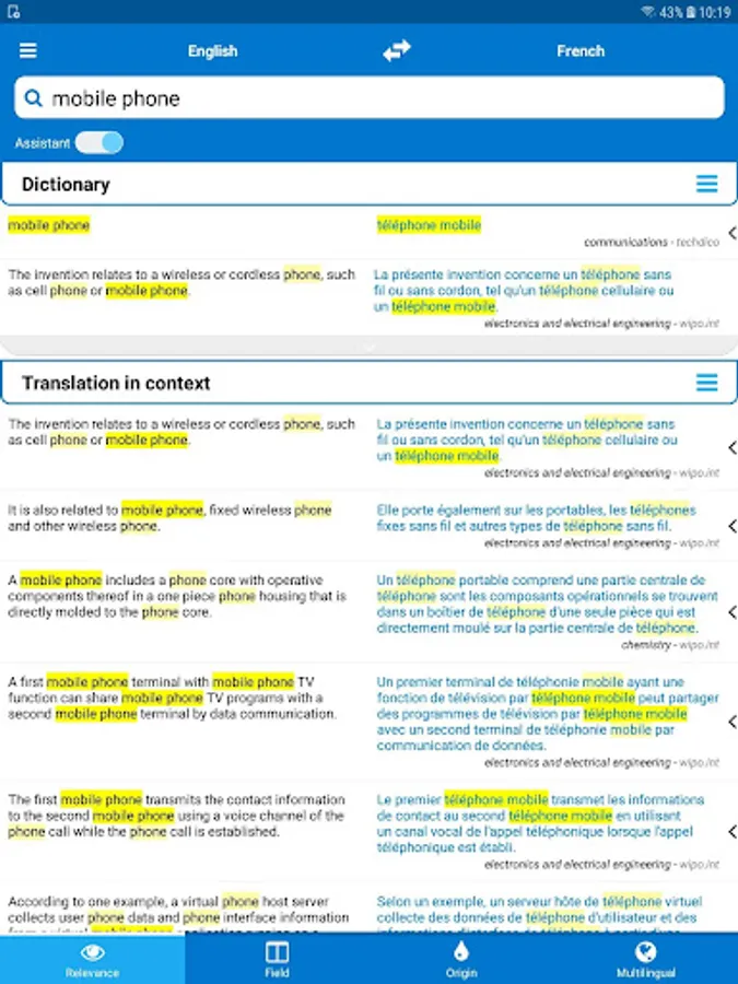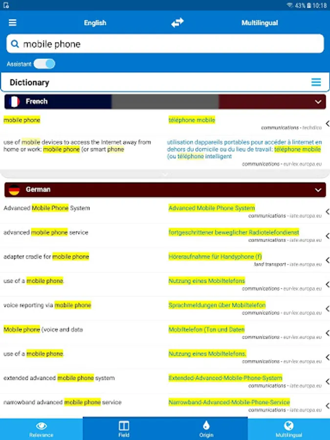 TechDico gives you acces to the most valuable translation ressources available: IATE (european terminology), Eur-Lex-Europa.eu (european law texts), WIPO (international patents), CJKI (Asian languages glossaries) and to multilingual specialized dictionaries.