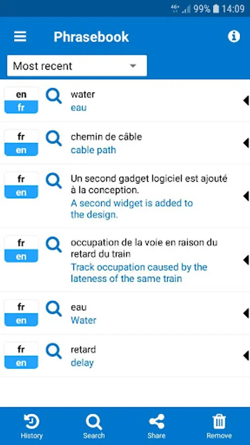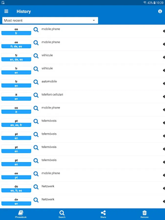 Store your translation history. Save your translation phrasebook.
