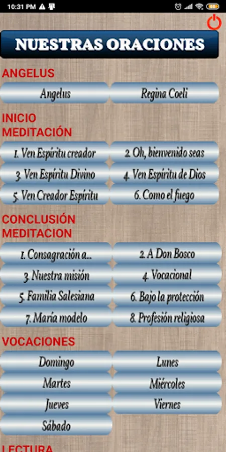 Small compendium of prayers that the Salesians of Don Bosco use in the Province of Divine Savior for meditation, Spiritual Reading and to ask for vocations. The prayers are those collected and published by Father Julio Navarro, Father Sergio Checchi and Father Heriberto Herrera. Here the only thing that has been done is to publish these sentences in the form of an application, for convenience in its use.
