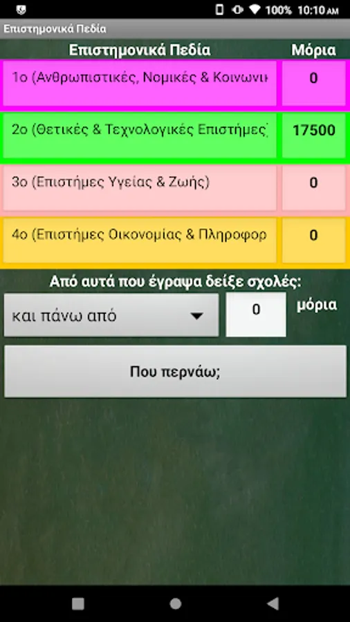 Easily and quickly calculate the points of the Panhellenic Examinations with the New System and the Old System of General Lyceums. The application is addressed to students, parents, relatives and friends who are directly or indirectly involved in the process of the Panhellenic Examinations.
