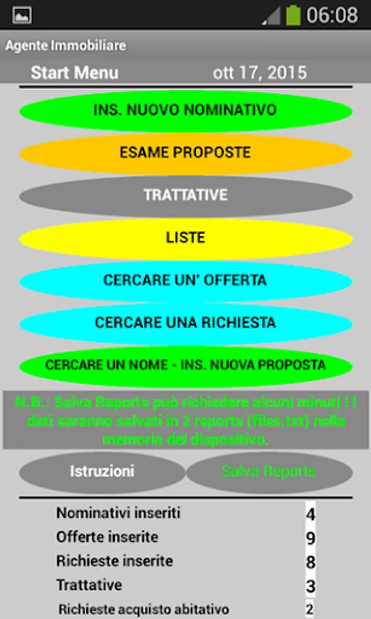 L 'app lets you save (to be performed always after each new data entry) your work on two reports (files.txt) to display and print for continuous monitoring of any proposals.