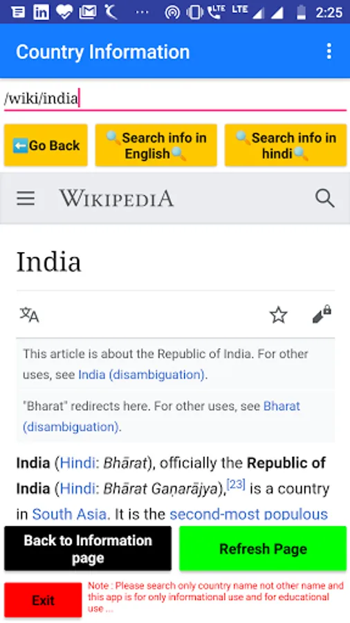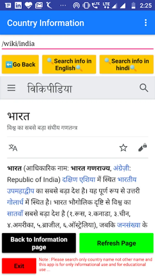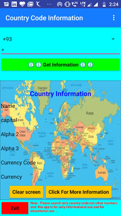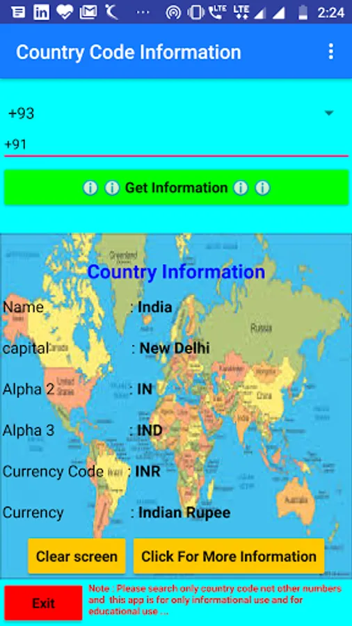 In this app we can search information on the clicking and searching of country code. We can search country information in search screen with tow language English and Hindi. This is Information and Educational App.