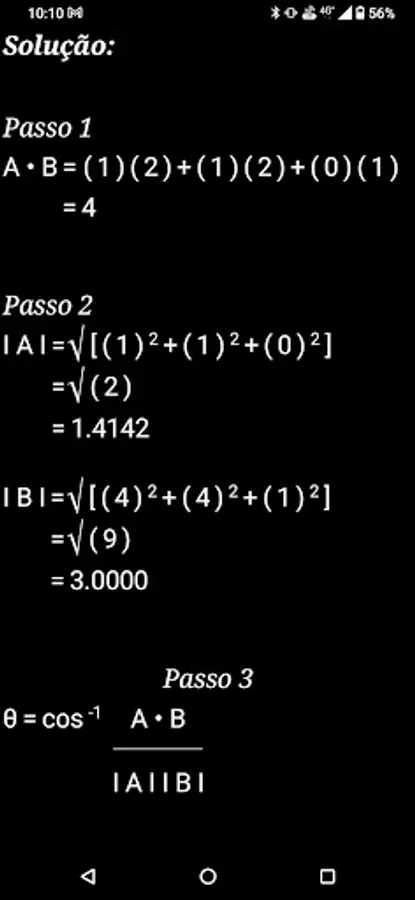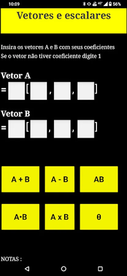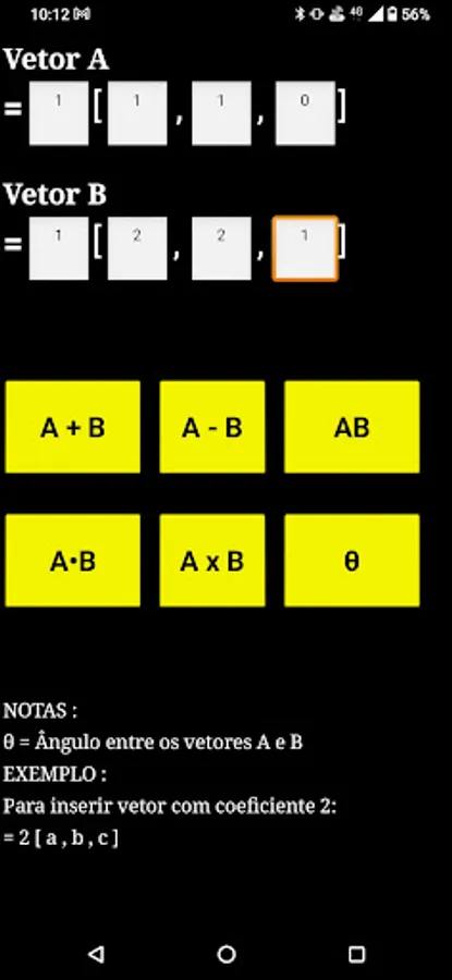 This App is aimed at teachers and students of Analytical Geometry and Linear Algebra, more specifically in the contexts of vector analysis. Most students find difficulties with operations involving vectors and scalars. We believe that this Application will help teachers and students during vector calculus classes, especially in verifying their resolutions. The App solves and shows the calculation for two vectors with or without coefficient. Solved problems include A+B, A-B, AB, A•B, AxB and angle between the two vectors.