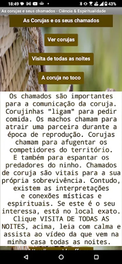 Owls and their calls is an application that presents the charms of this bird. The looks of science and spirituality on this bird with nocturnal habits.