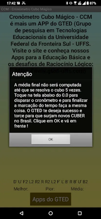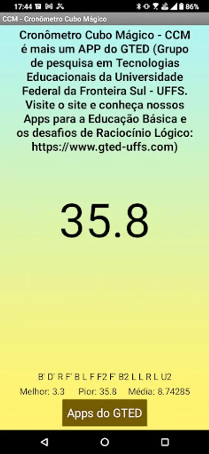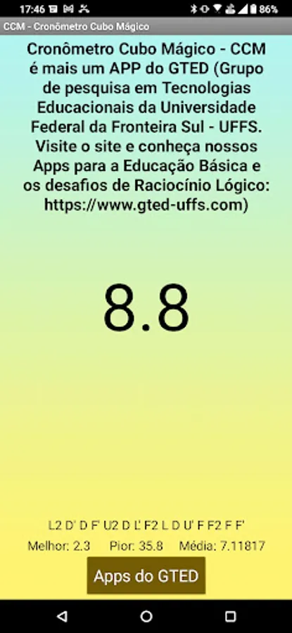 Magic Cube Stopwatch - CCM is an application that allows you to record the time spent to assemble the magic cube. The measurement is official for the championships, so the final average will only be counted after 5 rounds. The CCM records the best time, the worst and the partial and final averages after the 5 rounds. It is ideal for practitioners who want to reach the sub 9 and compete in championships in different modalities.