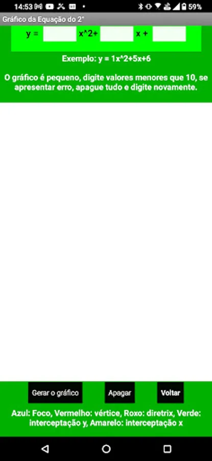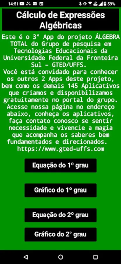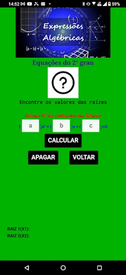 It is an application that enables the practical learning of algebraic calculations. It presents the formulas of the 1st and 2nd equations, makes it possible to insert data and check the results and even generate graphs of the equations or algebraic expressions informed by the users.