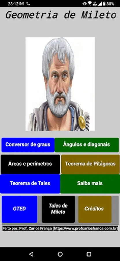 The App meets the main points of Basic Education Geometry. It presents the geometric formulas, makes calculations possible. Provides the theorems of Pythagoras and Thales of Miletus, enunciates the story of this great philosopher, mathematician and thinker of the sixth century BC.