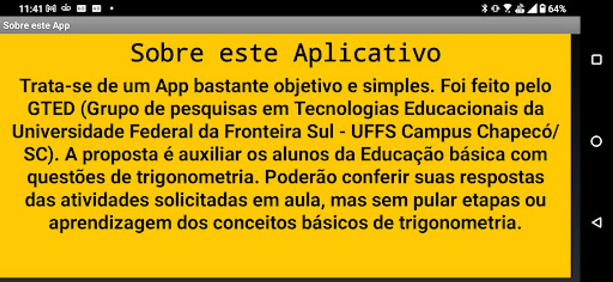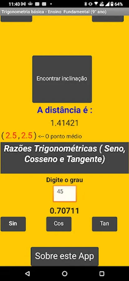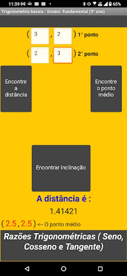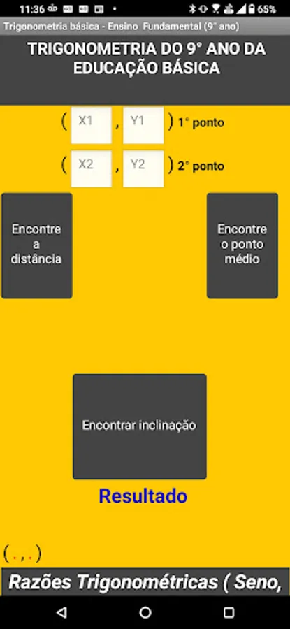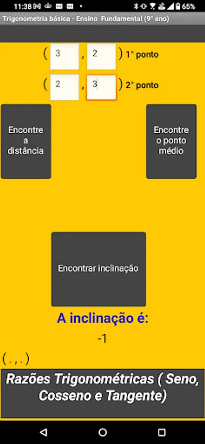 It is an application for basic calculations of trigonometric ratios taught in the 9th grade of Elementary School. It is possible to find the sine, cosine, tangent values and analyze the geometric properties between two points. The user will be able to calculate the slope between the points, the midpoint and the distance between them.