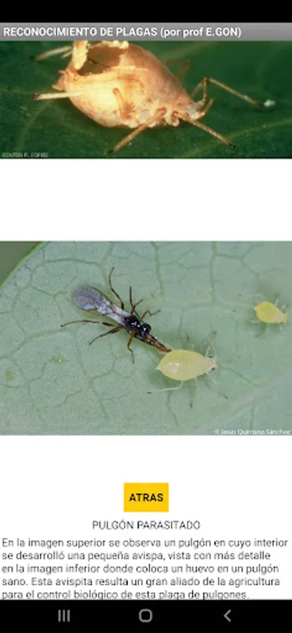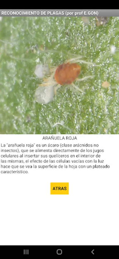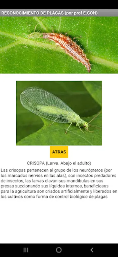 IT IS AN APP DESIGNATED FOR THE RECOGNITION OF SPECIES OF THE MOST COMMON PESTS THAT AFFECT CROPS IN PRODUCTIVE ENVIRONMENTS. IT IS DESIGNED FOR THE STUDY OF THE BASIC AGRICULTURAL CYCLE OF THE SCHOOLS OF THE PROVINCE OF BUENOS AIRES (ARGENTINA)