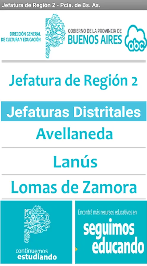 This application is developed to unify and provide data from the different Education departments of Region 2 of the Province of Buenos Aires. The districts that make it up are: Avellaneda, Lanús and Lomas de Zamora.