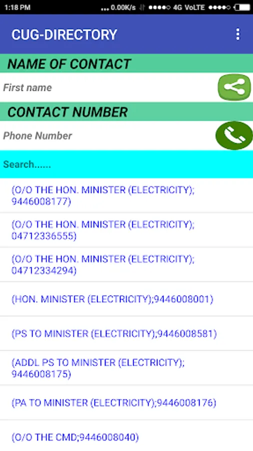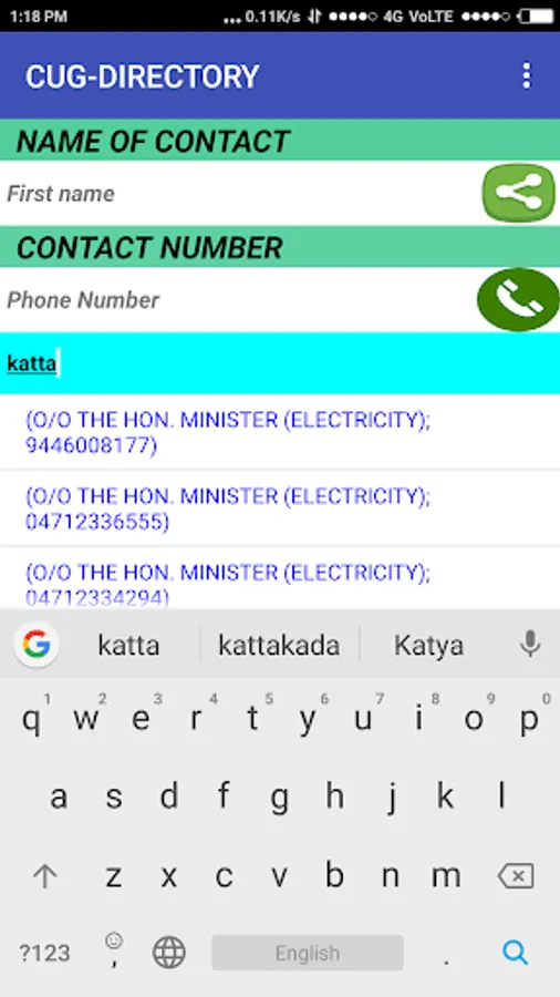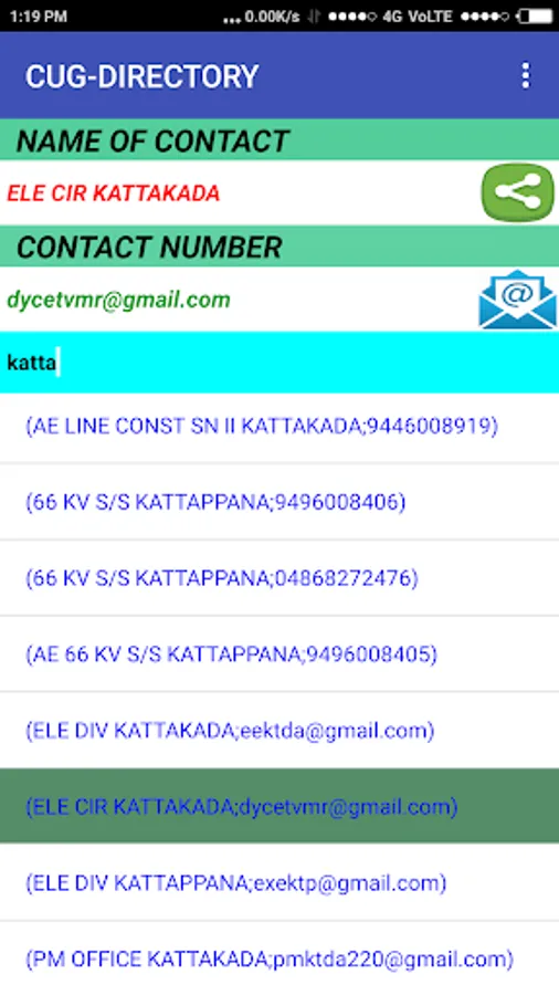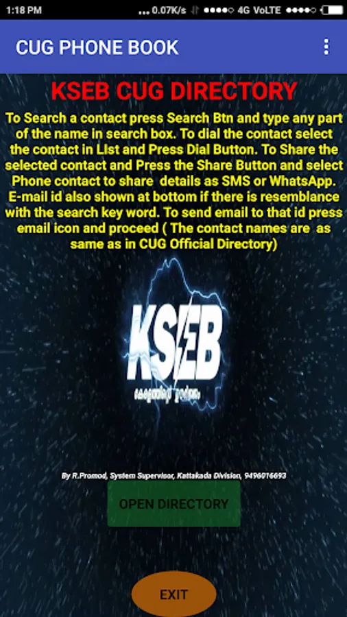 This application is created with app-inventor and it includes almost all contact details in CUG Directory of KSEB. With this application we can search a contact with name or a contact with its number and make call. Also there is available email contacts by which we can directly open the gmail application with the contact mail. we can also share the selected contact as sms , whatsapp and gmail etc with others
