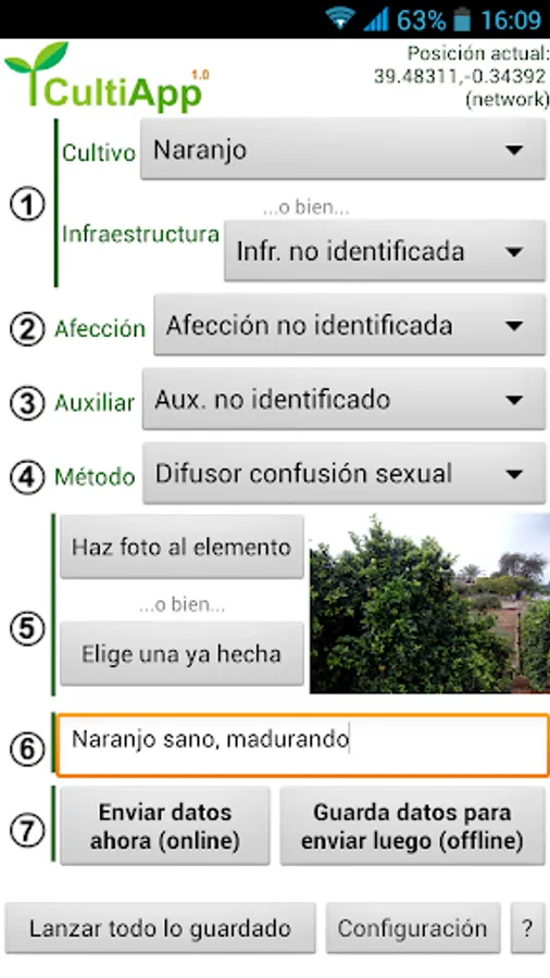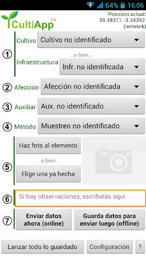 Through this application, a geolocated image with its coordinates of a crop or agricultural infrastructure can be uploaded to the Crop Protection server, while other parameters such as conditions, auxiliaries or methods are collected, with their observations.