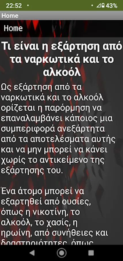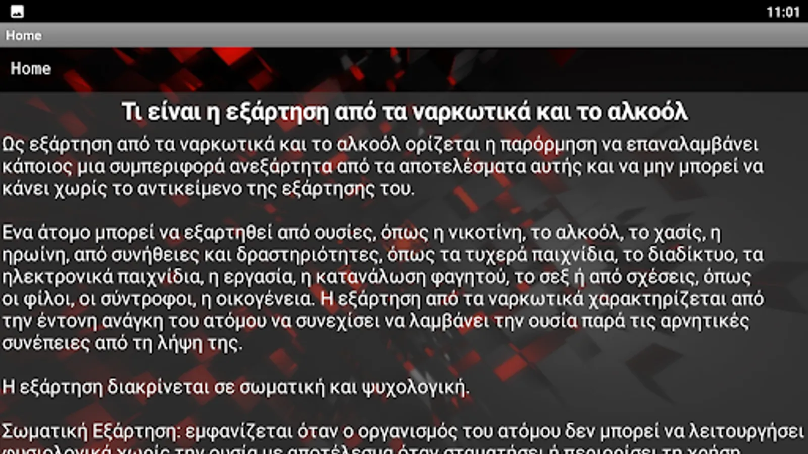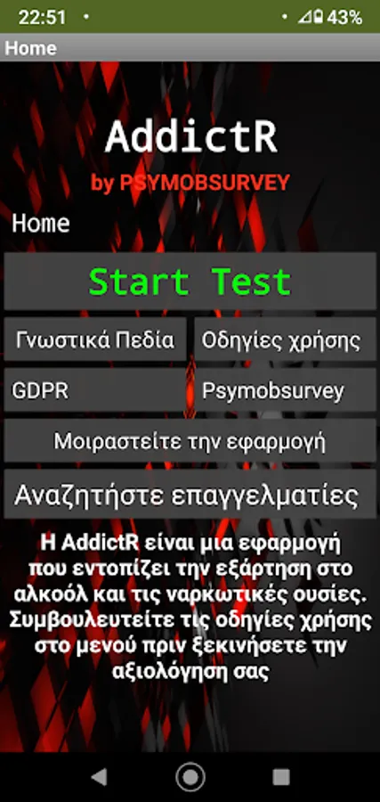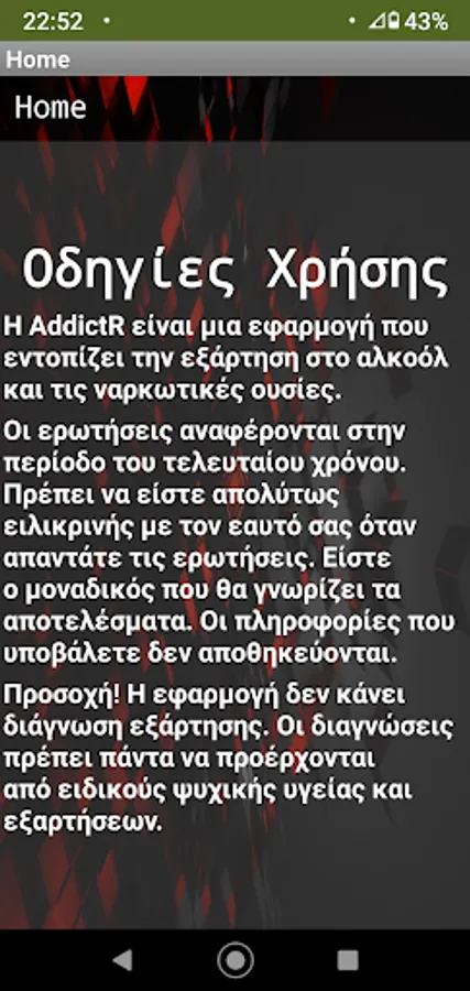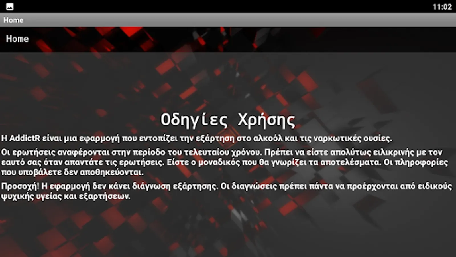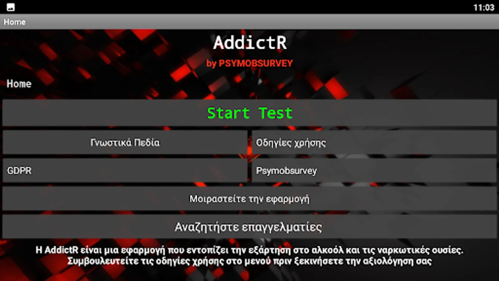 AddictR is an application that detects alcohol and drug addiction. Through a 20-question questionnaire the user of the application can identify if there is a problem of alcohol or drug addiction, be informed about the addiction and seek an addiction or mental health specialist.