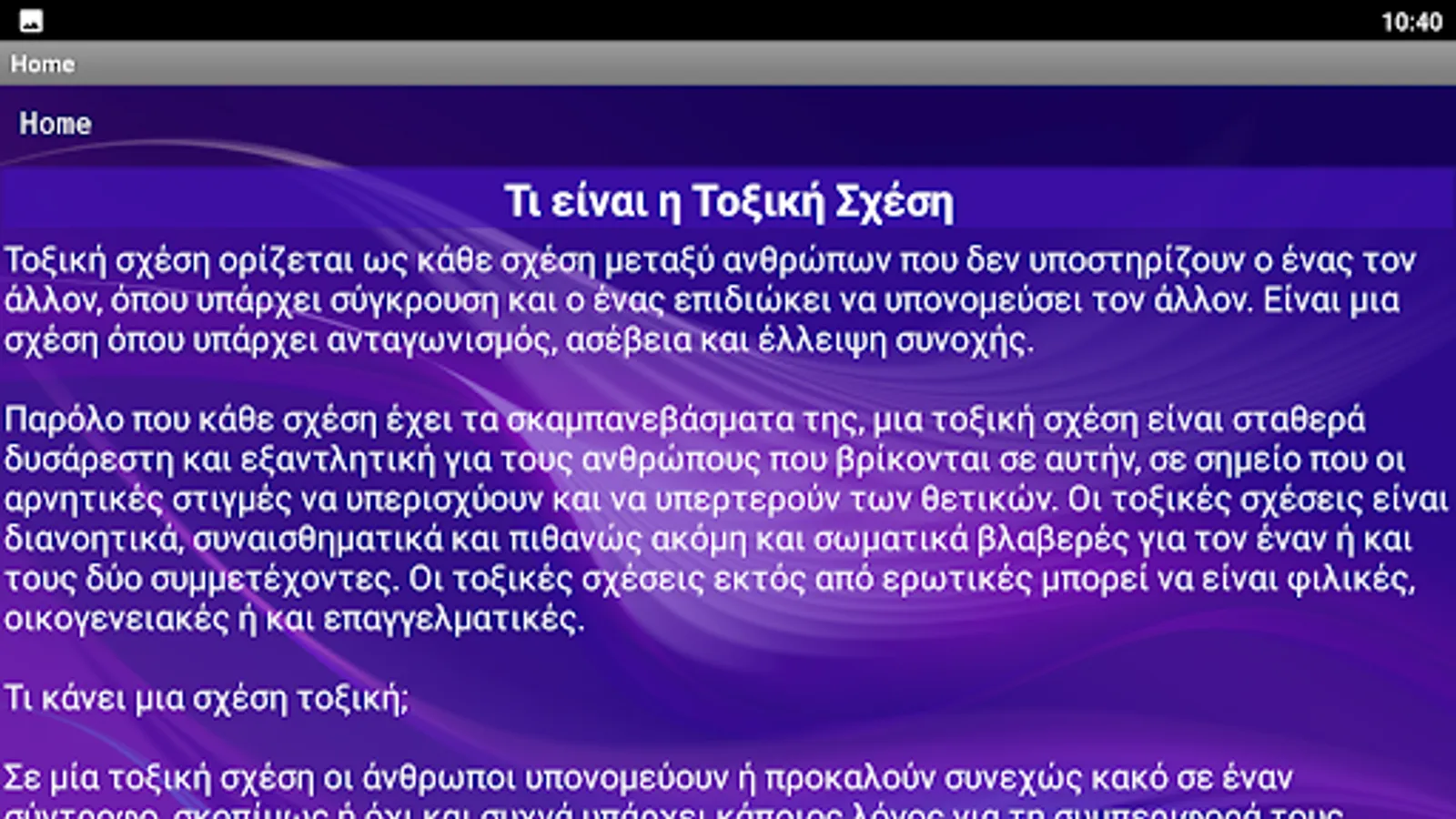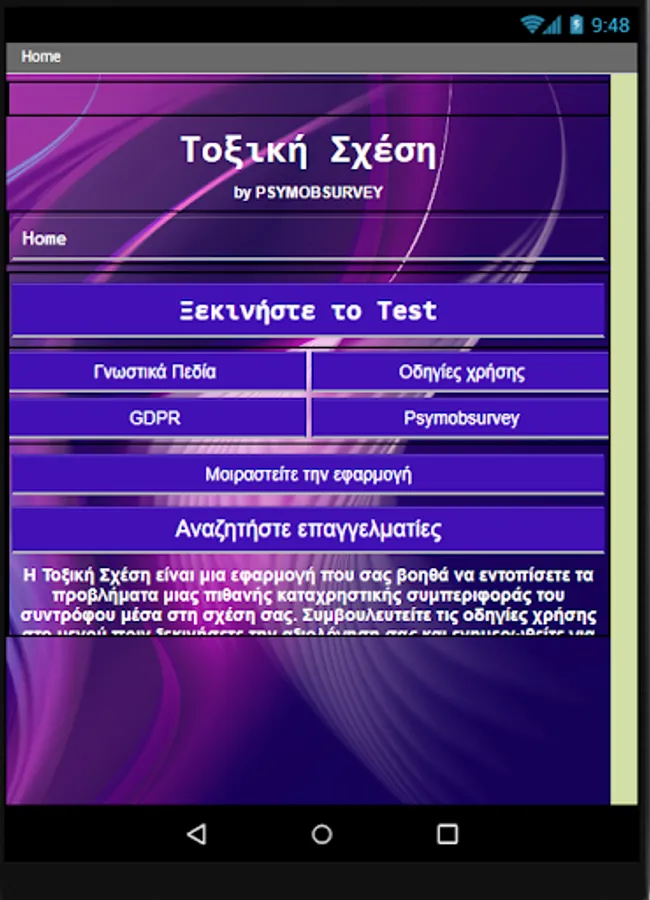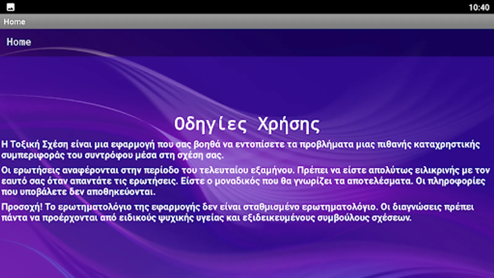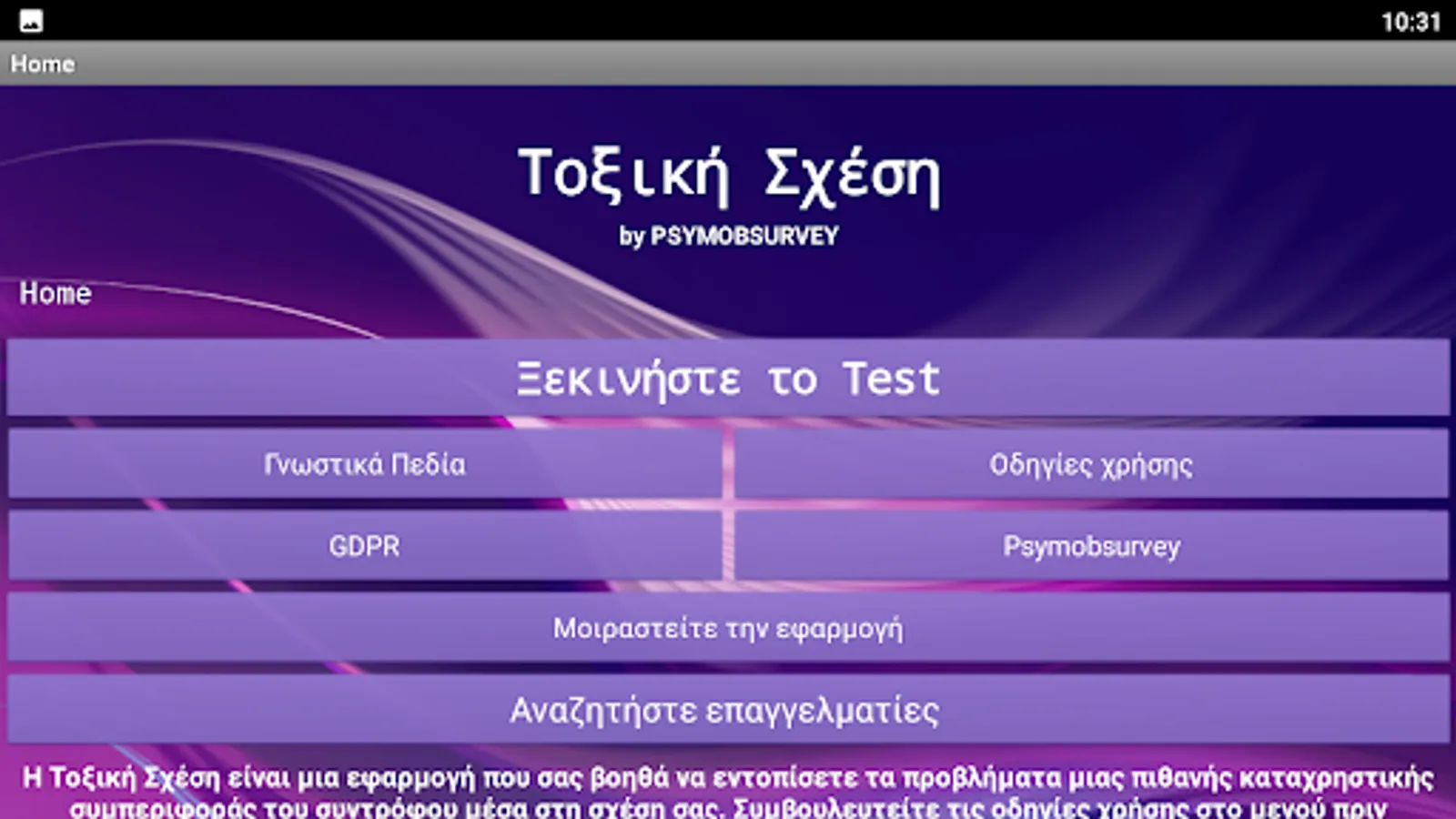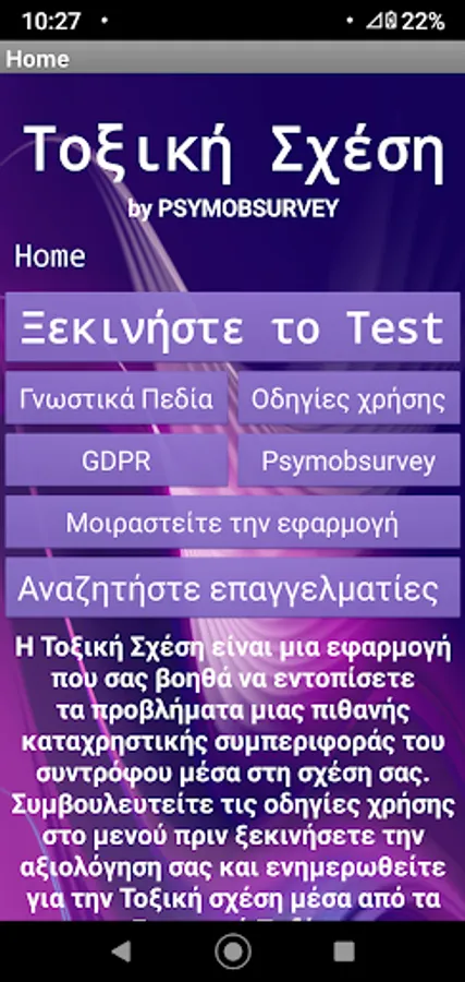 Toxic Relationship is an application that helps you identify the problems of a potential abusive behavior of your partner in your relationship. Consult the instructions for use in the menu before starting your evaluation and find out about the Toxic Relationship through the Cognitive Fields