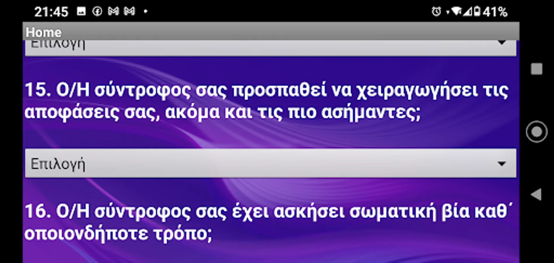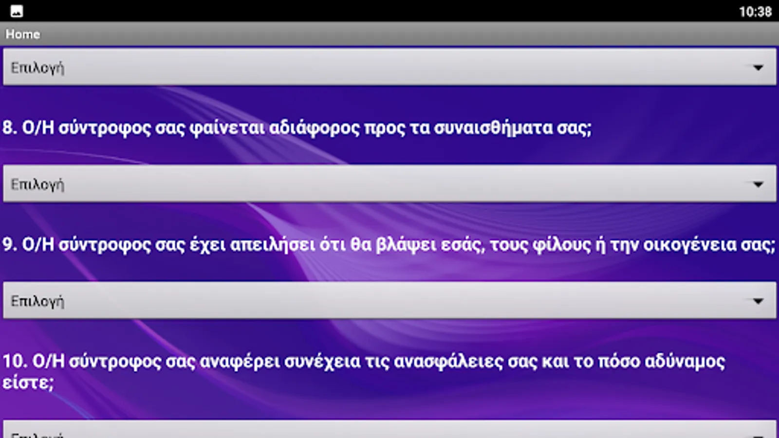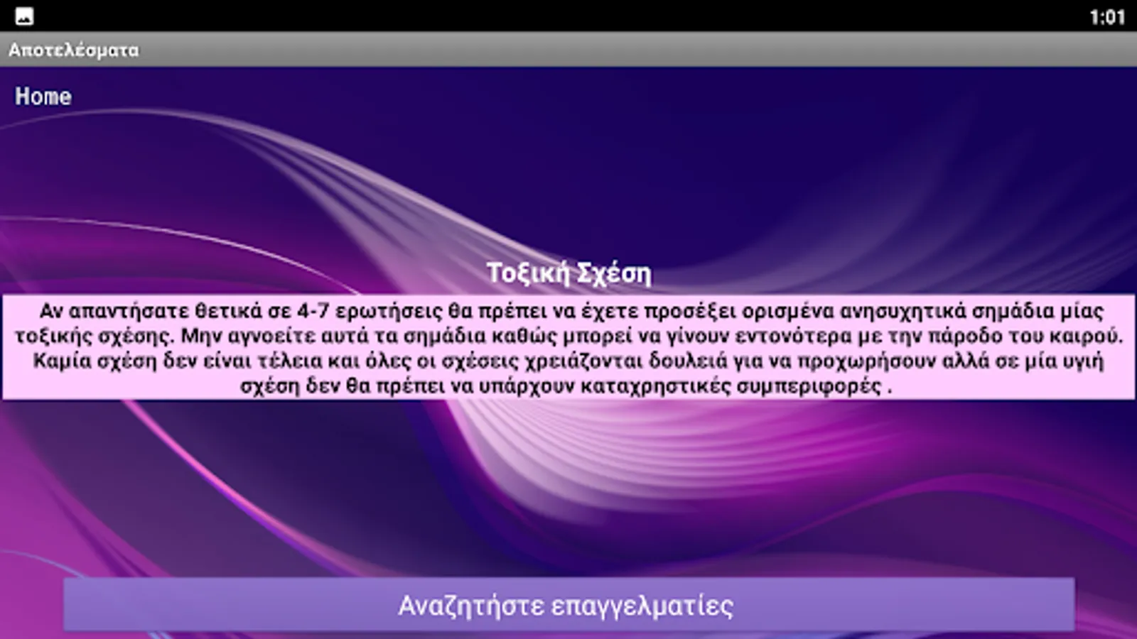 Toxic Relationship is an application that helps you identify the problems of a potential abusive behavior of your partner in your relationship. Consult the instructions for use in the menu before starting your evaluation and find out about the Toxic Relationship through the Cognitive Fields