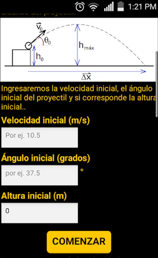 Designed with a friendly and simple format, the application allows us to interact with different variables such as initial velocity, the angle of the projectile and the initial height.