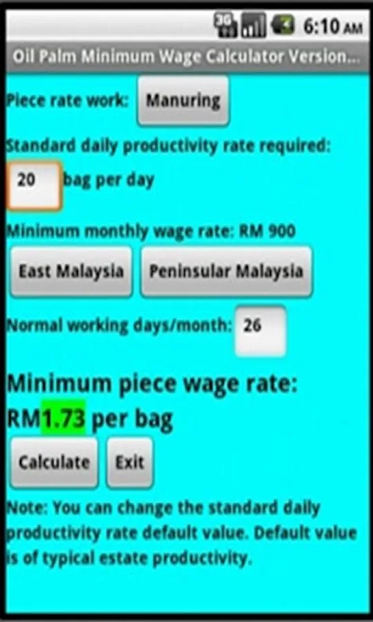 This calculator app is designed for calculating new wage rate for oil palm plantation piece rated work to be in compliance with the Minimum Wage Order 2012 implemented by the Ministry of Human Resources, Malaysia which is to be effective from 1 January 2013. This calculator is a useful and must-have tool for oil palm plantation management as well as internal auditors for oil palm plantations in Malaysia to set or verify minimum wage for piece rated work which will be in compliance with the minimum wage order as well as reflective of the daily standard productivity rate required for each piece rated work. This calculator is applicable for oil palm plantation in Sabah, Sarawak and Peninsular Malaysia.