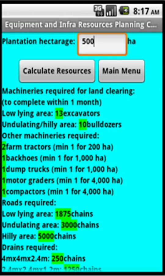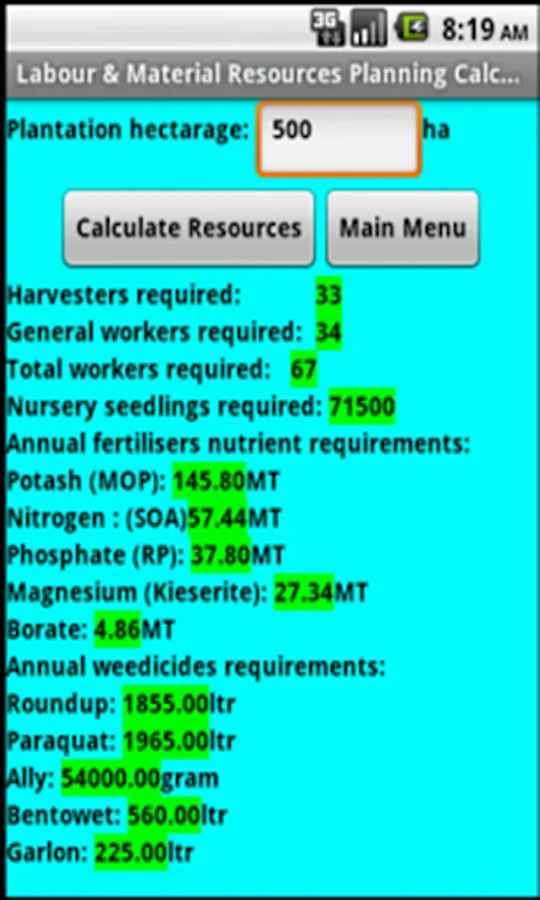 This calculator app is designed for calculating resources such as equipment, infrastructure, workers, seedlings, fertilisers and weedicides required to run an oil palm plantation. This calculator is a useful and must-have tool for oil palm plantation management to perform annual resources planning and budgeting for oil palm plantation. This calculator is applicable for oil palm plantation in Sabah, Sarawak and Peninsular Malaysia. This app is also useful for plantation owners to determine whether the resources employed and acquired are sufficient or overly excessive for their plantation hectarage.