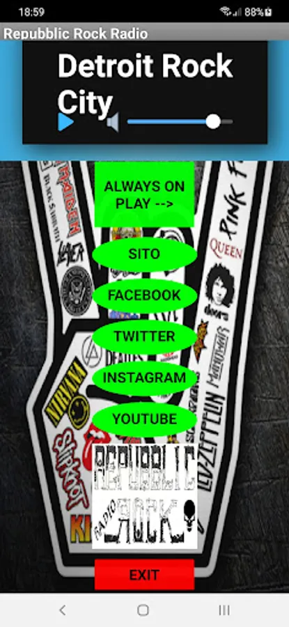 - exit button: closes the app but if you have opened the ALWAYS ON PLAY page or the microsite page does not stop the audio, you will need to close the audio page to stop listening