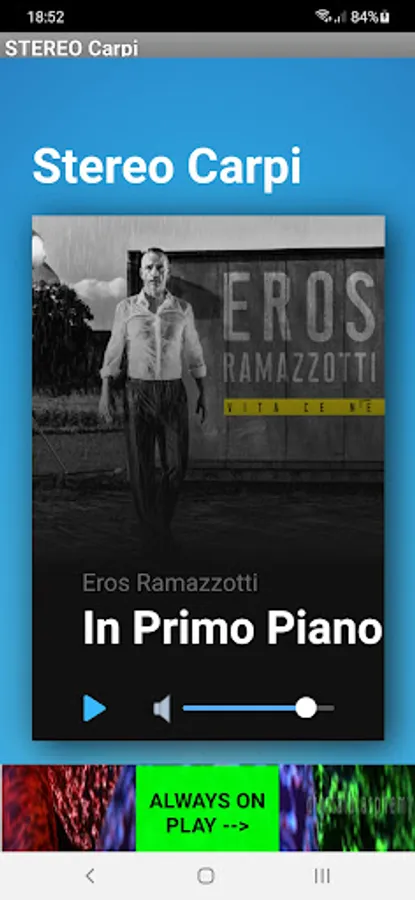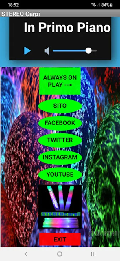- exit button: closes the app but if you have opened the ALWAYS ON PLAY page or the microsite page does not stop the audio, you will need to close the audio page to stop listening
