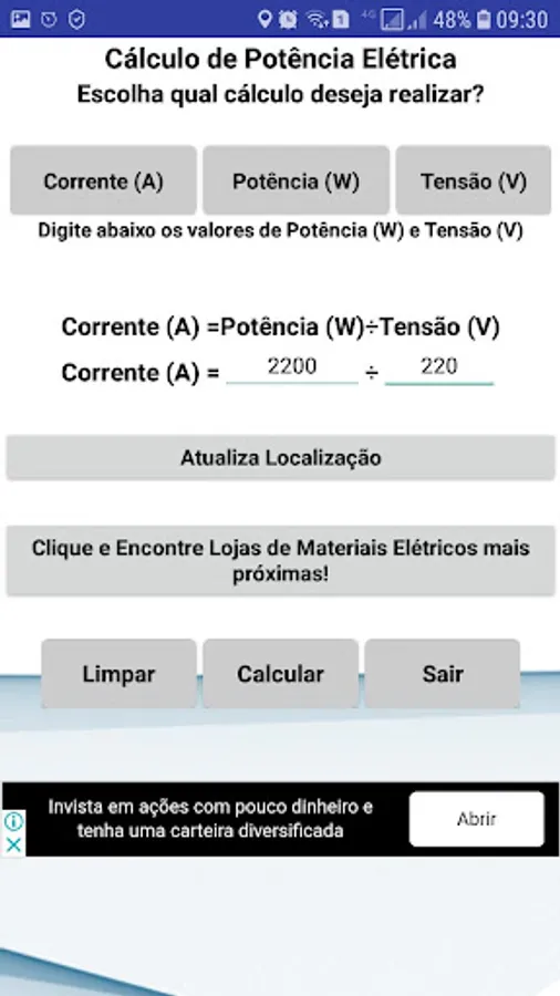 App developed to perform calculations that electric power is obtained by multiplying the voltage (V) for the current (A), the result of which is in watts (W) and current calculations (A) and voltage (V).