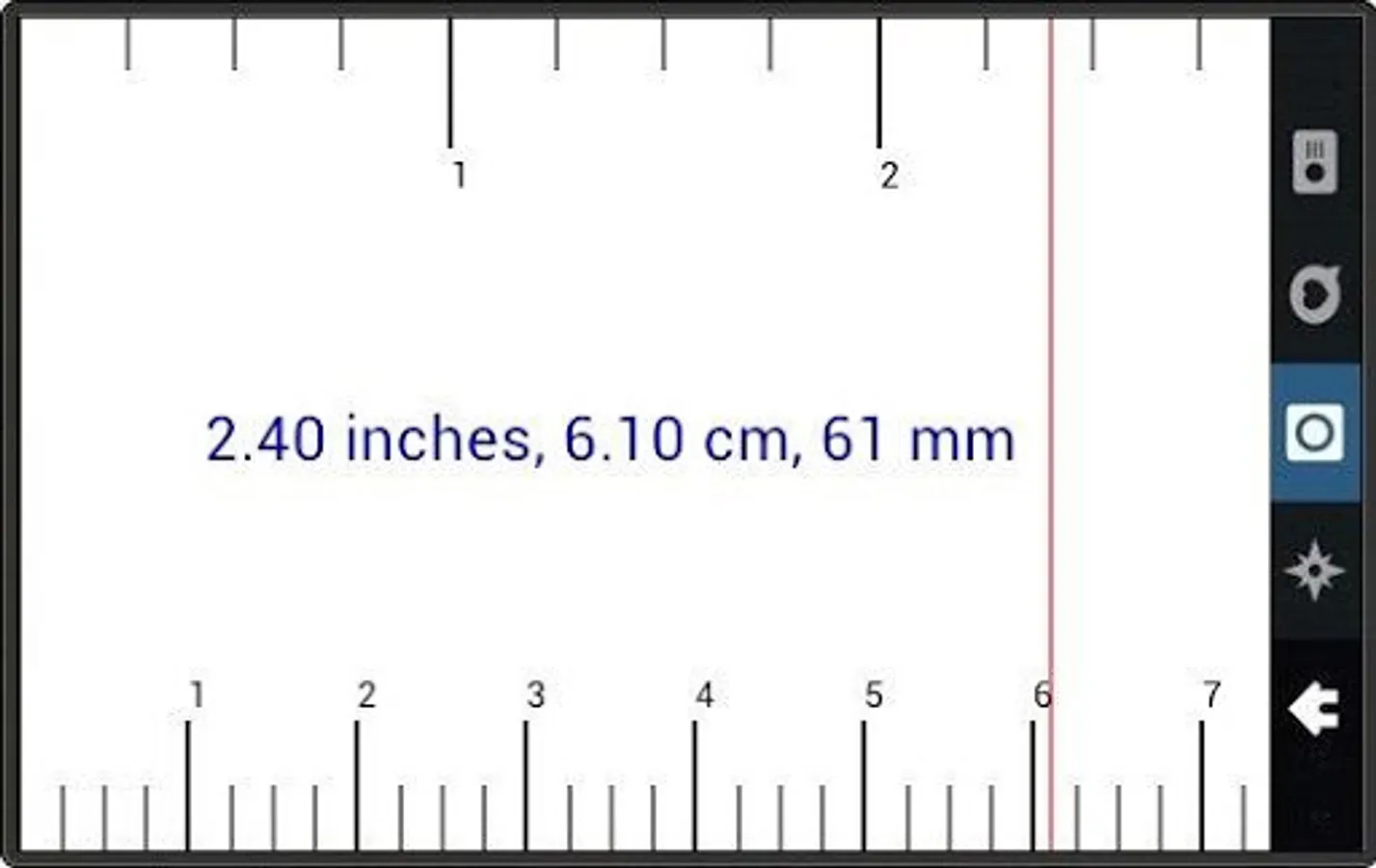 The rulers are drawn as inches and centimetres. The measuring vertical line can be dragged to the required position or positioned by tapping on either side of the screen to give readings in inches, cm and mm.