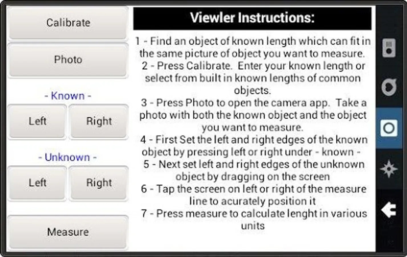 Visual Ruler requires that you select a known length, take a picture using your phone and then position 4 measuring lines on screen over the photo taken to calculate length of unknown object relative to known object. When you take the photo position both objects near each other and try to zoom in on them as much as you can. This means you will get more accurate results.