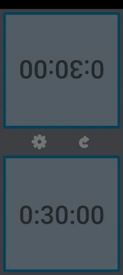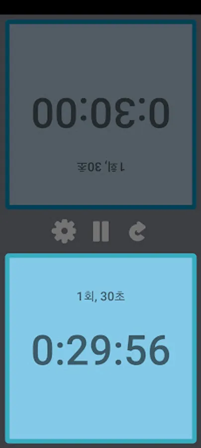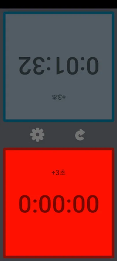 When you touch the gray screen, the other person's screen changes to mint color and the time decreases. When you press the stop button in the center, it pauses and the screen turns gray. When the set time is over, the screen turns red.