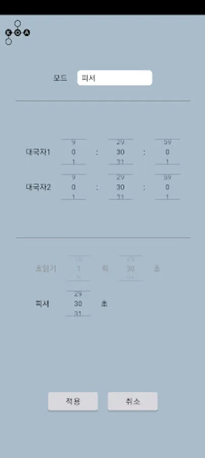 When the setting button located on the left of the center is pressed, it moves to the setting screen. You can set basic mode, countdown mode, fisher mode, etc. on the setting screen, and you can set each player's time at will. Once set, the setting information will be memorized.
