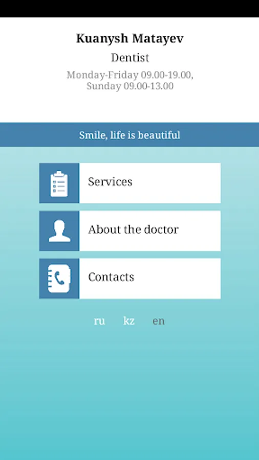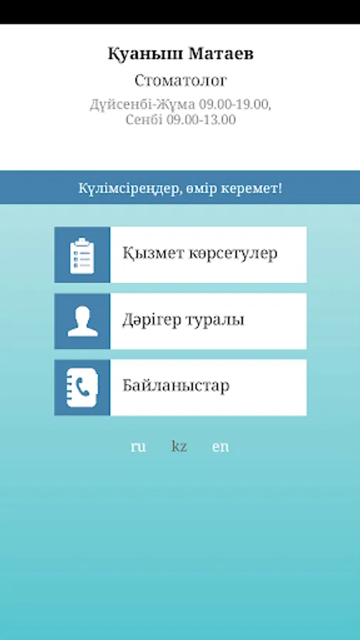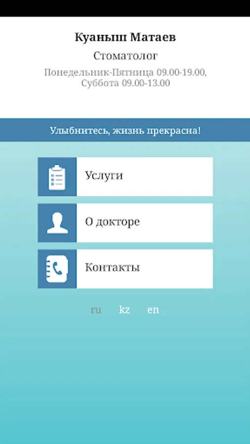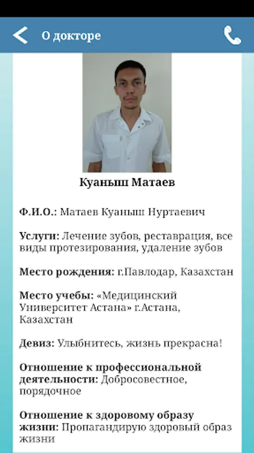 MatayevStom - this is a personal application-card of the dentist Matayev Kuanysh Nurtaevich from the city of Pavlodar (Kazakhstan). My attitude to professional activity is honest, decent. Using the application, you can see the list of services, as well as contact the doctor and ask questions about dentistry.
