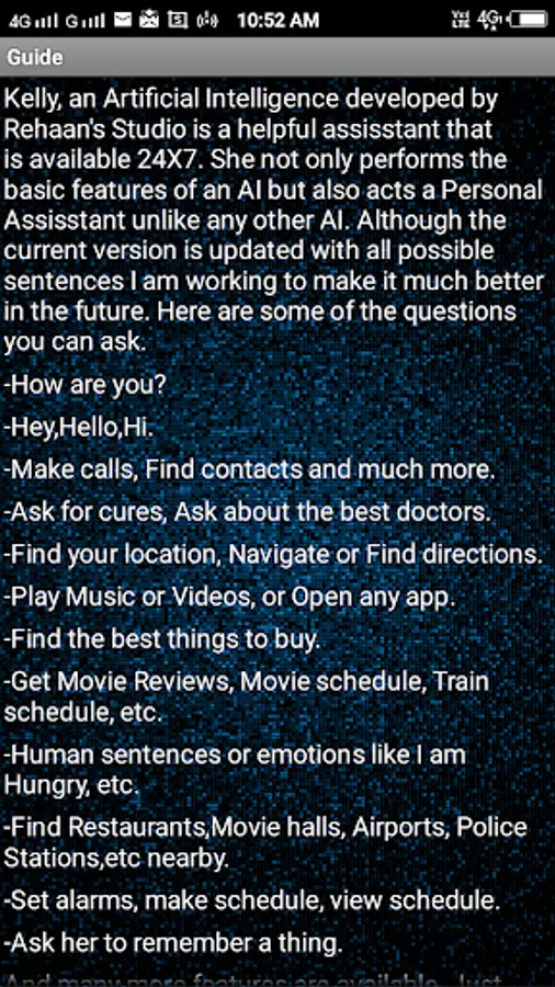 Kelly is an Artificial Intelligence or Personal Assistant developed for Android. It occupies a space of only 16 MB after download and yet it does all the work of a smart AI. You can perform various activities in the app.You can find roads, call cabs, ask her to remember something, call someone and many more. For help check the guide in the app. More information will be updated.