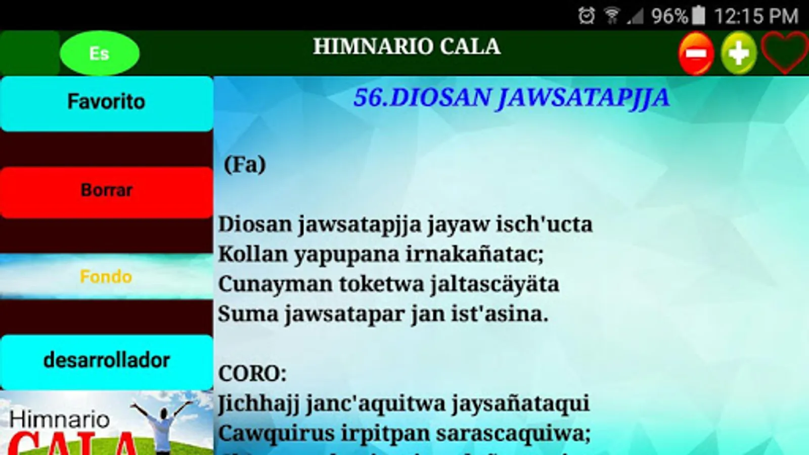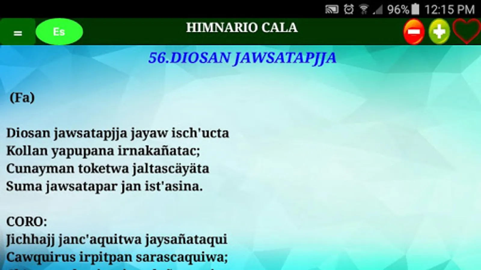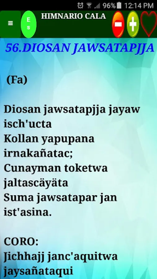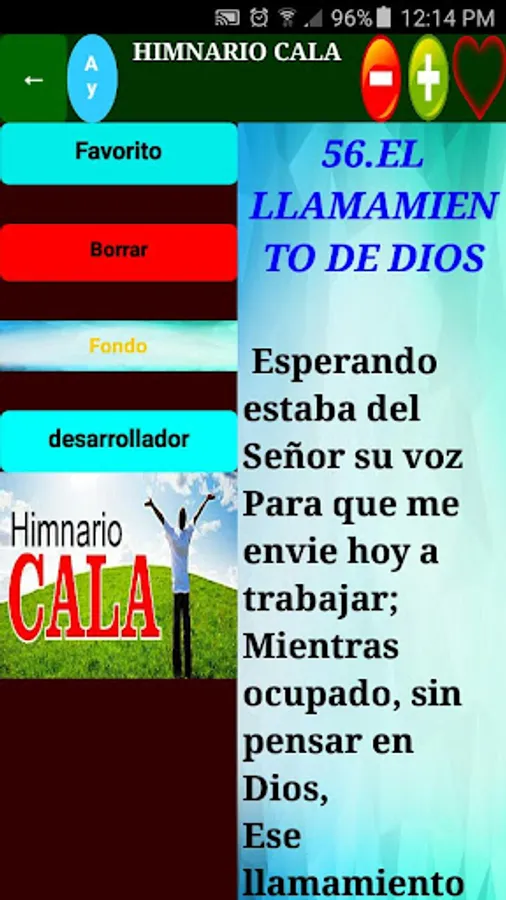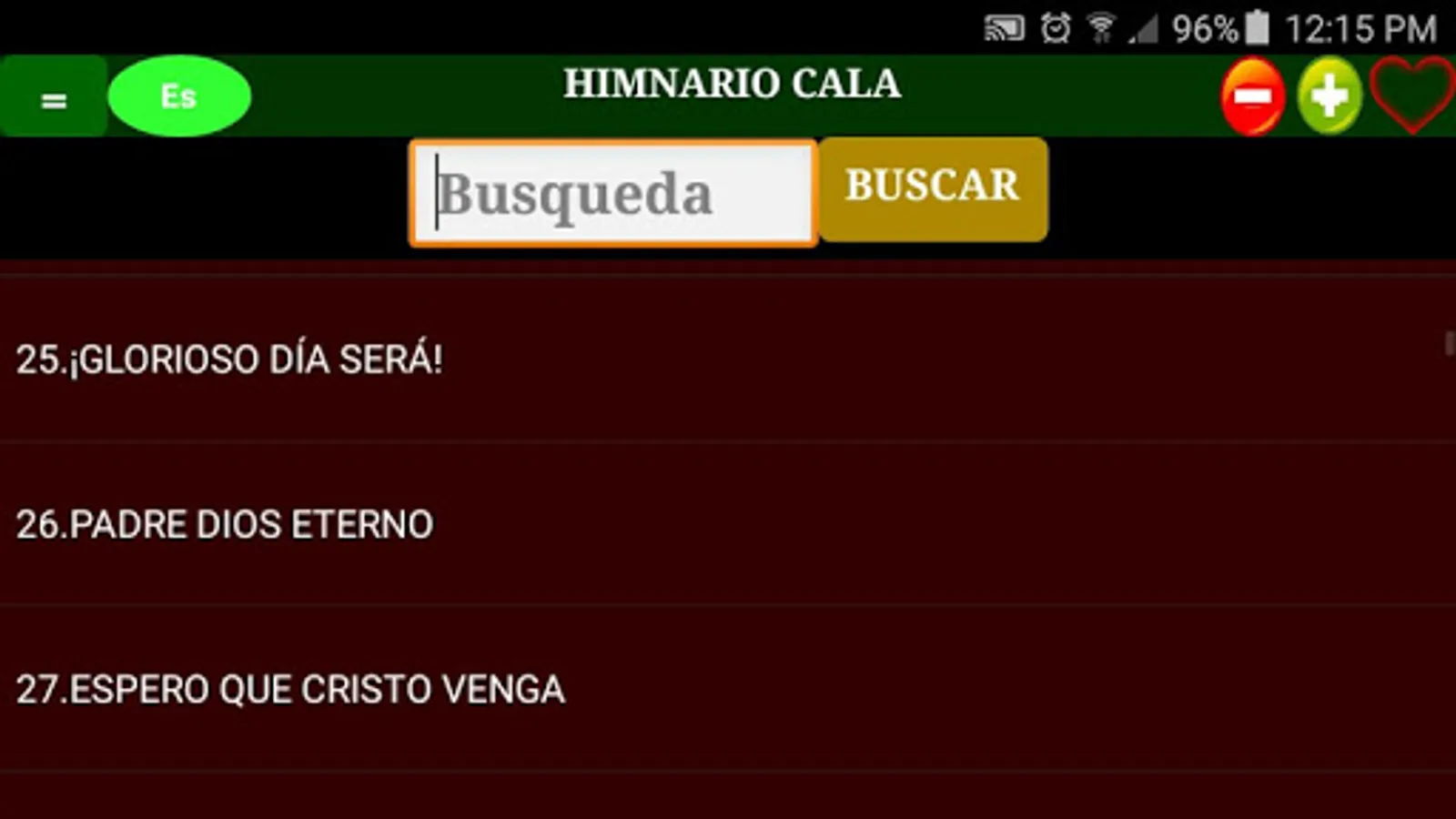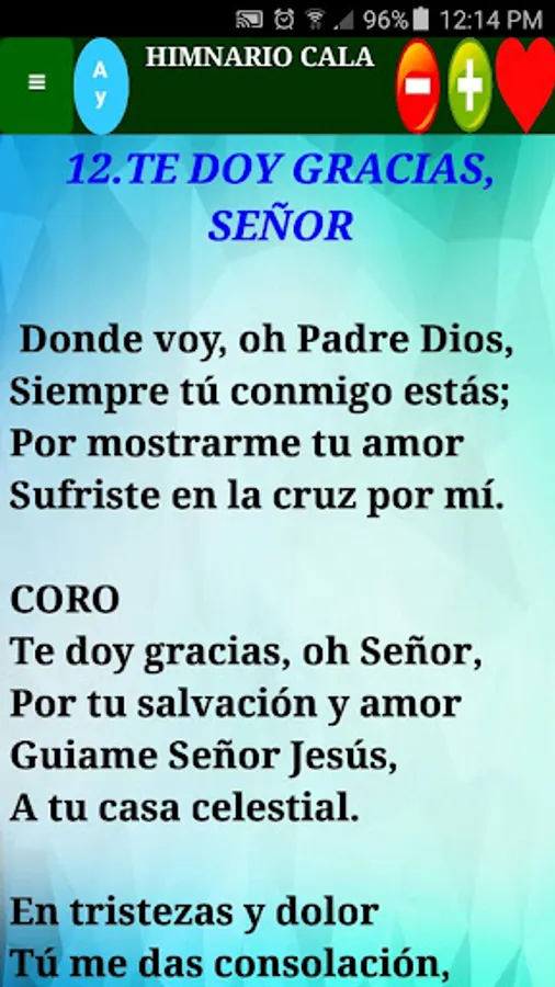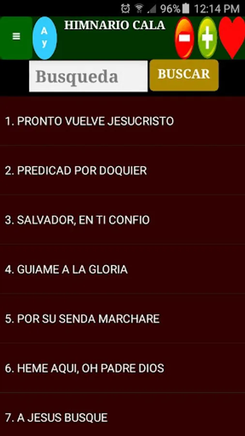 You will find all the hymns in the hymnal, you can modify the size of the letters and you can change the background color and search by number or name.