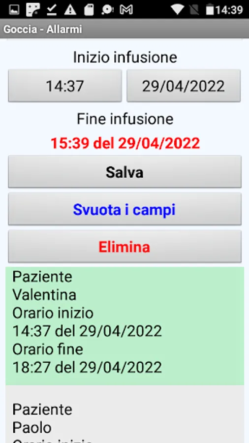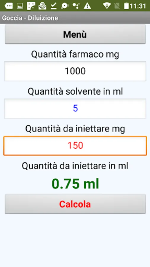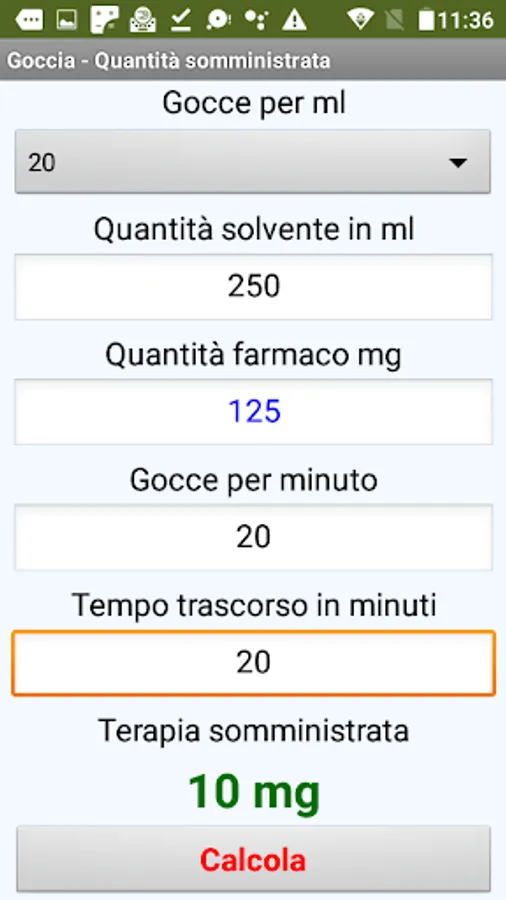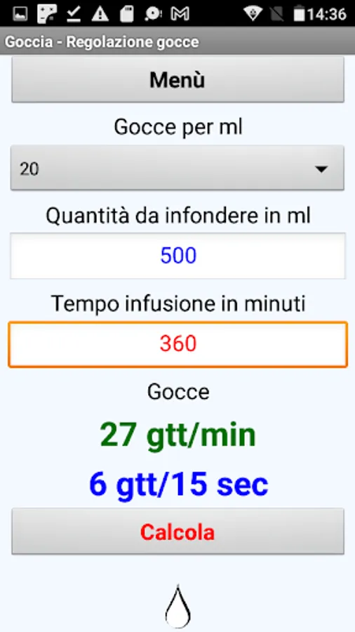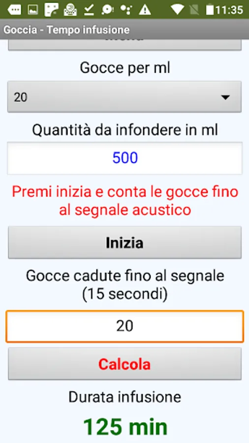 Application for calculating the amount of drug to be administered after its dilution in a solvent. Calculation of the regulation of the speed of the drops in the infusion set to obtain a certain infusion time of the infusion. Calculation of the duration of the infusion of the drip in low to the speed of the drops. Calculation of the amount of drug administered based on the infusion time and the speed of the drip drops. Sound alarm settings 5 minutes after the end of the infusion.