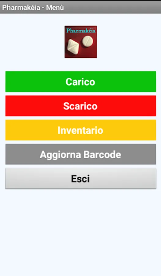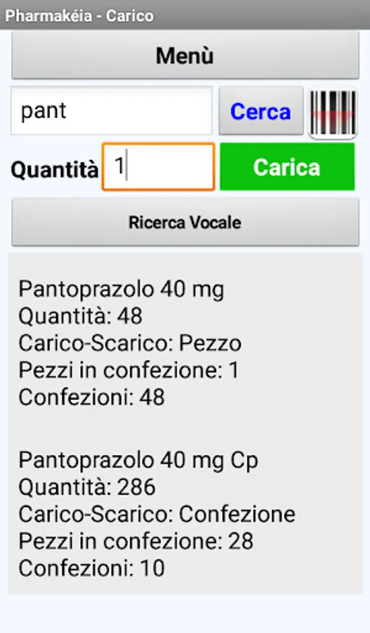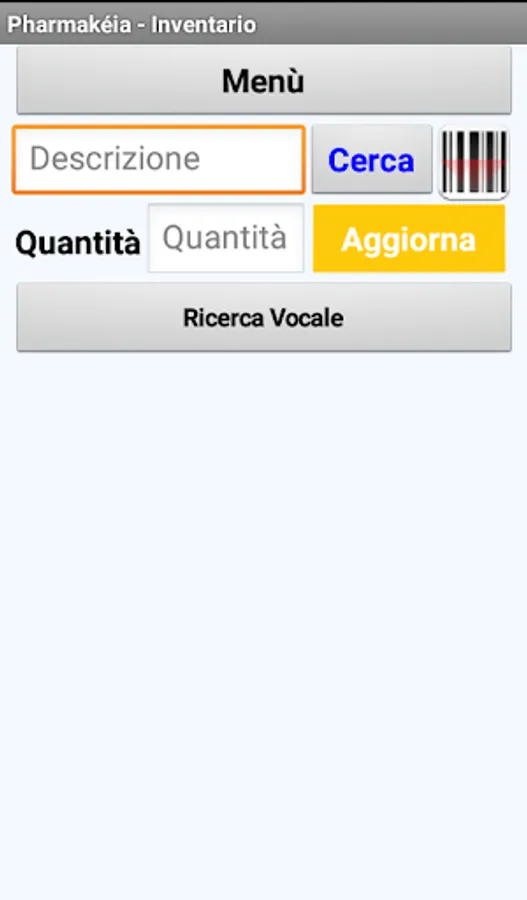 The Android application allows you to load and unload the quantity in the warehouse, either by typing the description, or using the smartphone camera as an optical reader and with the voice call of the drug. It allows you to make an instant inventory, either by typing in the description, or using the smartphone camera as an optical reader and with the voice call of the drug. It allows the immediate updating of the drug barcode if this has changed, using the smartphone camera as an optical reader.