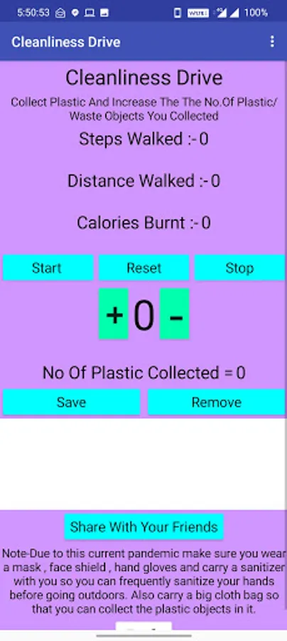 Before using the Cleanliness Drive, you have to read the note given. The cleanliness drive feature will measure the steps, distance walked, and calories burnt. While walking, you have to add how much waste/plastic you collected. You can save data and remove data (It will still be saved when the app is closed, too, with the help of TINYDB). You can plan a cleanliness drive with your friends and share all the above information collected in a cleanliness drive with your friends, with the help of a share button given.