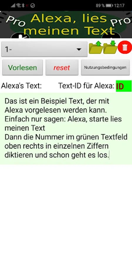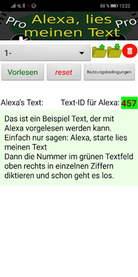 Note: If you are asked to continue reading with the "continue" command, the last text is repeated again if you do not react at all. Then the skill stops. You can also end the skill at any time with "End". The next time you start, the next text block is used to read. Its size can be set in the settings.