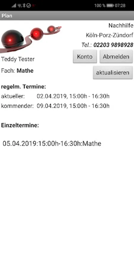 The app shows you the weekly recurring appointments and individual appointments. If recurring appointments fall into school holidays, they will be skipped and you will see the next appointment afterwards. In the holidays there is no tutoring, except by special arrangement.